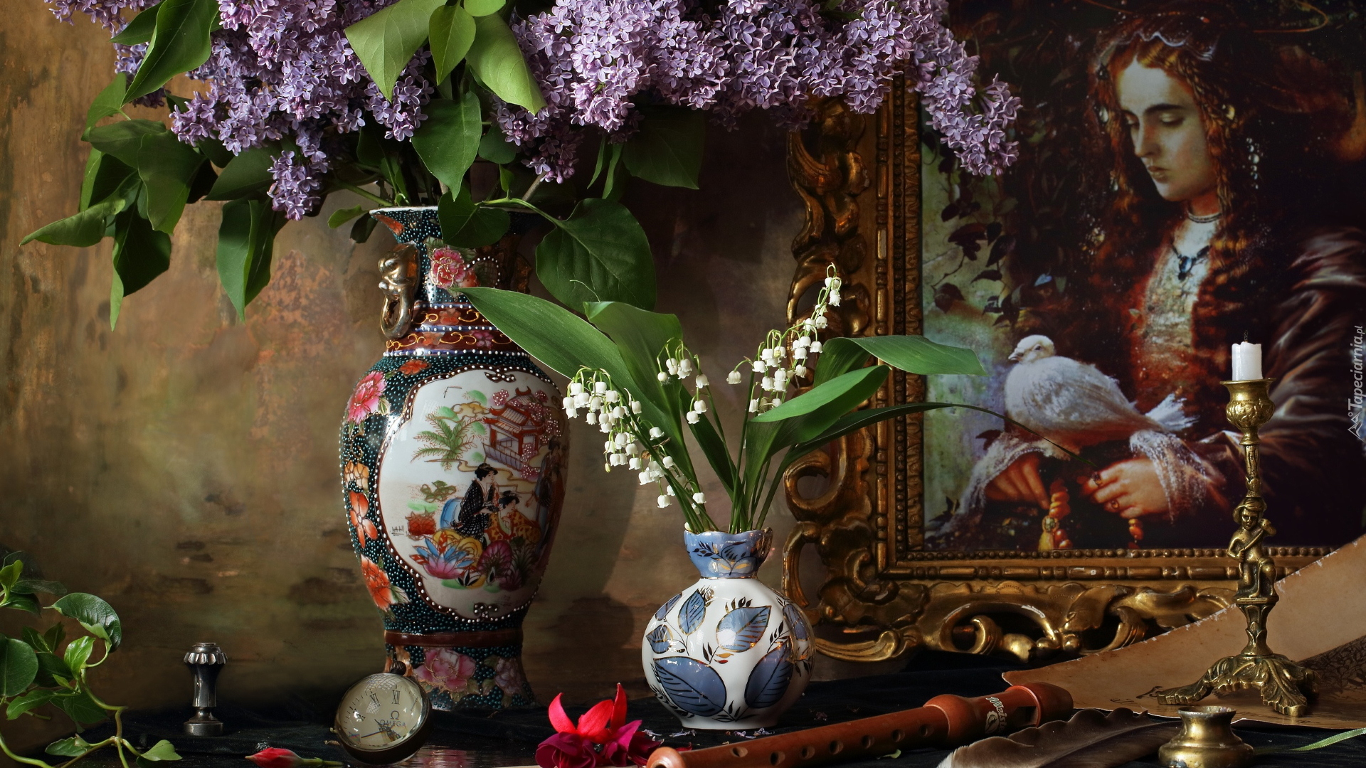 Edytor tapety: Bez i konwalie w wazonach obok obrazu