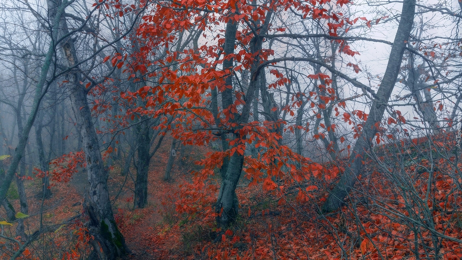 Edytor tapety: Drzewo z czerwonymi liśćmi w zamglonym lesie