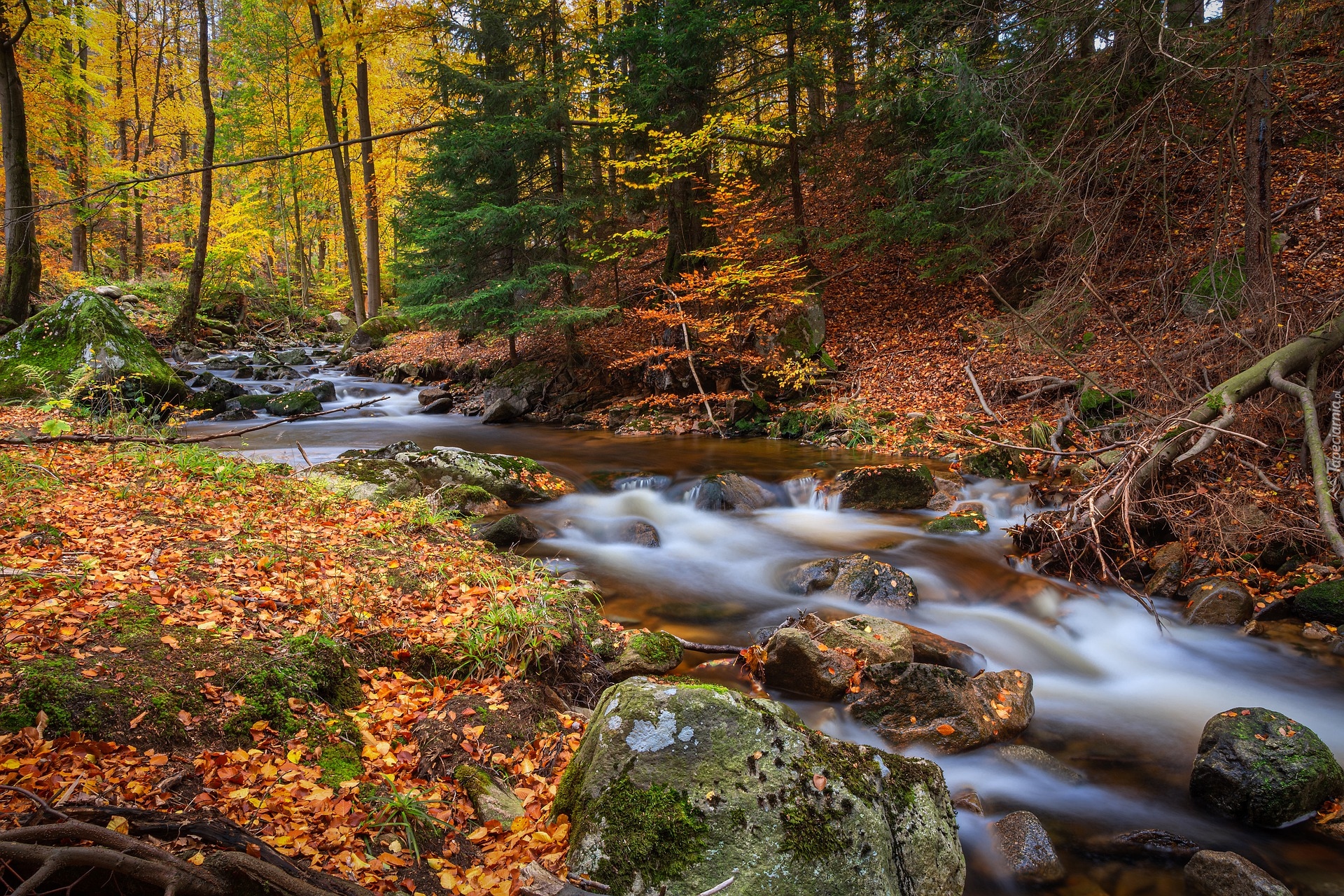 Edytor tapety: Opadłe liście i kamienie przy leśnej rzece
