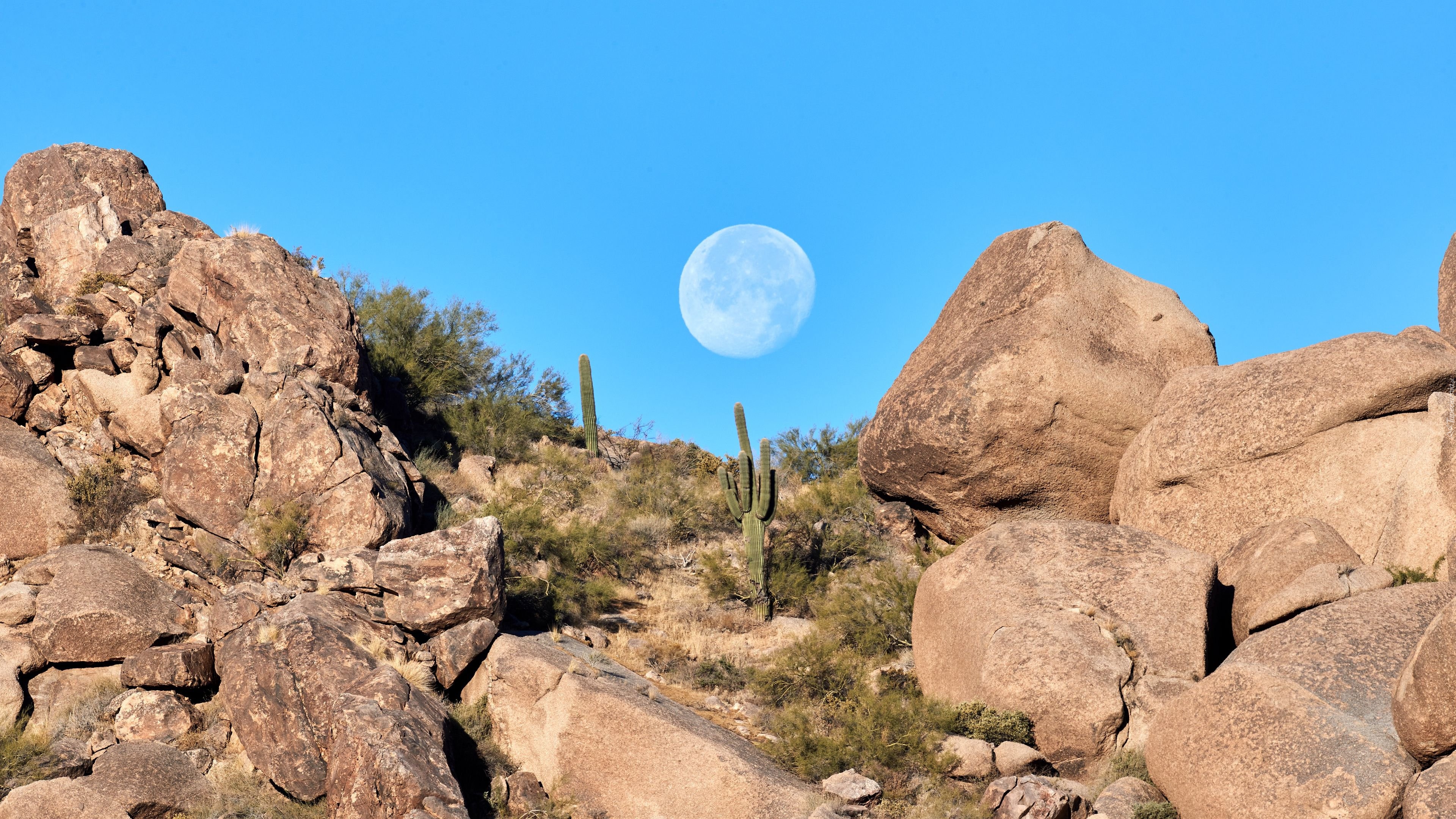 Edytor tapety: Kaktusy na skałach i księżyc na niebie
