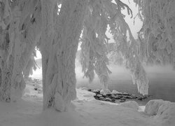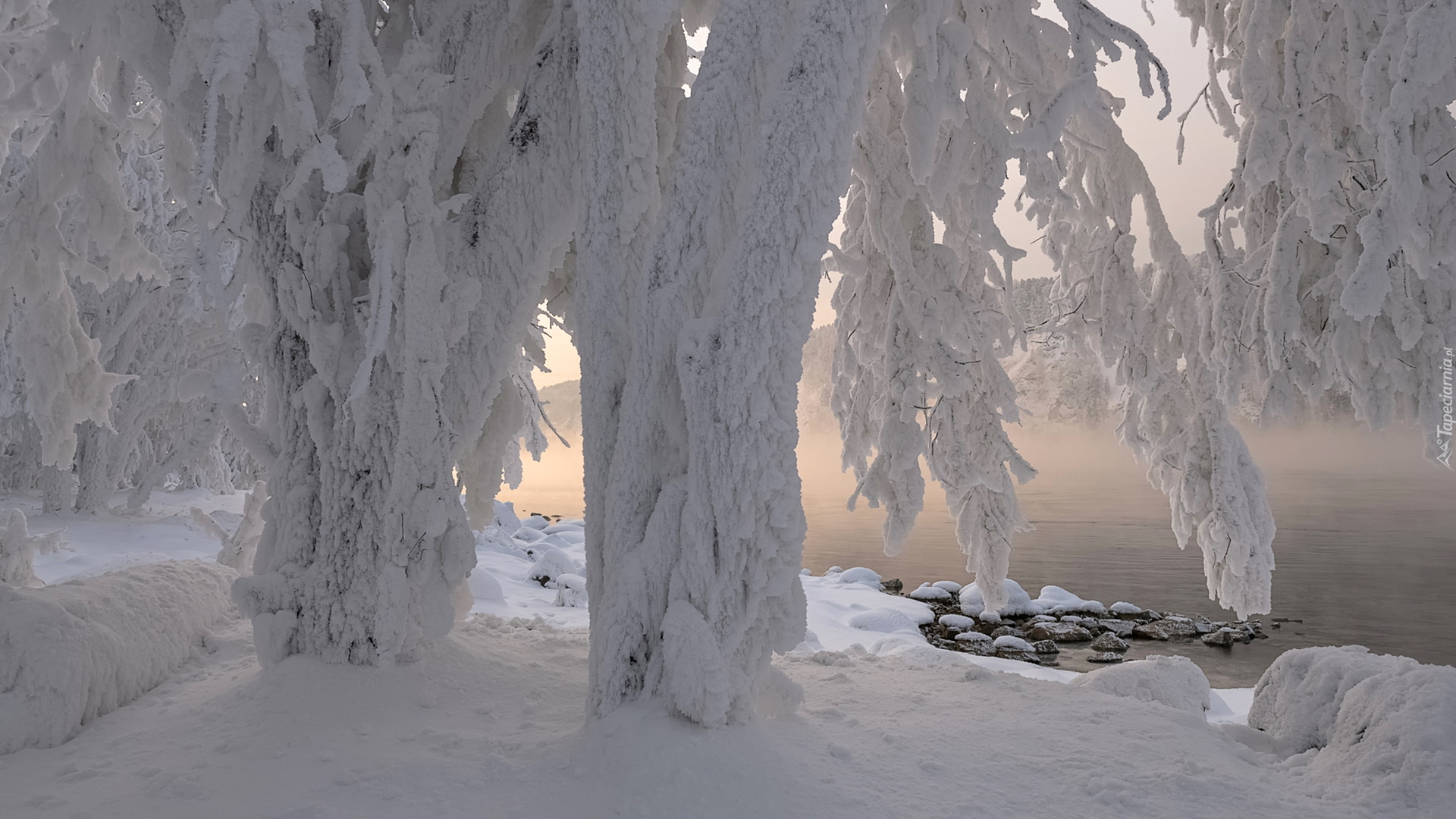 Edytor tapety: Zasypane śniegiem drzewa nad zamglonym jeziorem