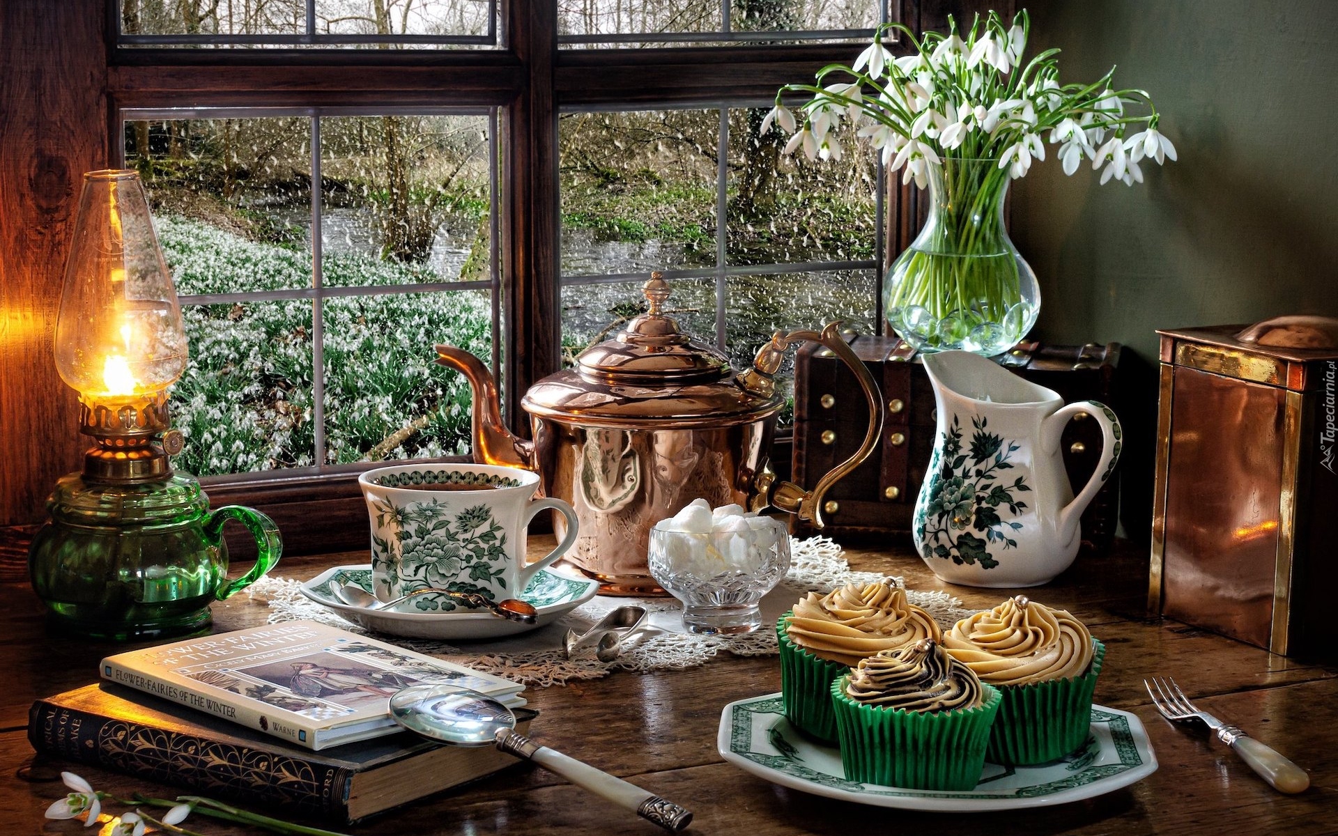 Edytor tapety: Kompozycja z bukietem przebiśniegów i babeczkami przy oknie