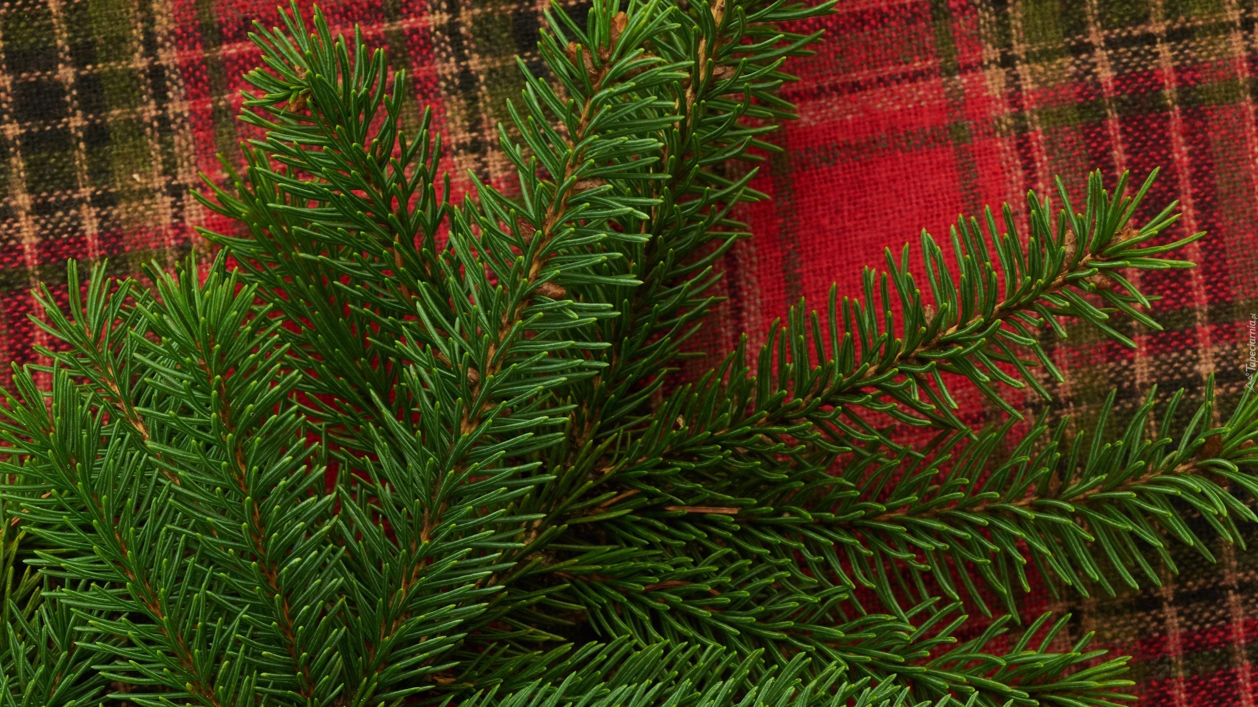 Edytor tapety: Gałązka sosny na kraciastym pledzie