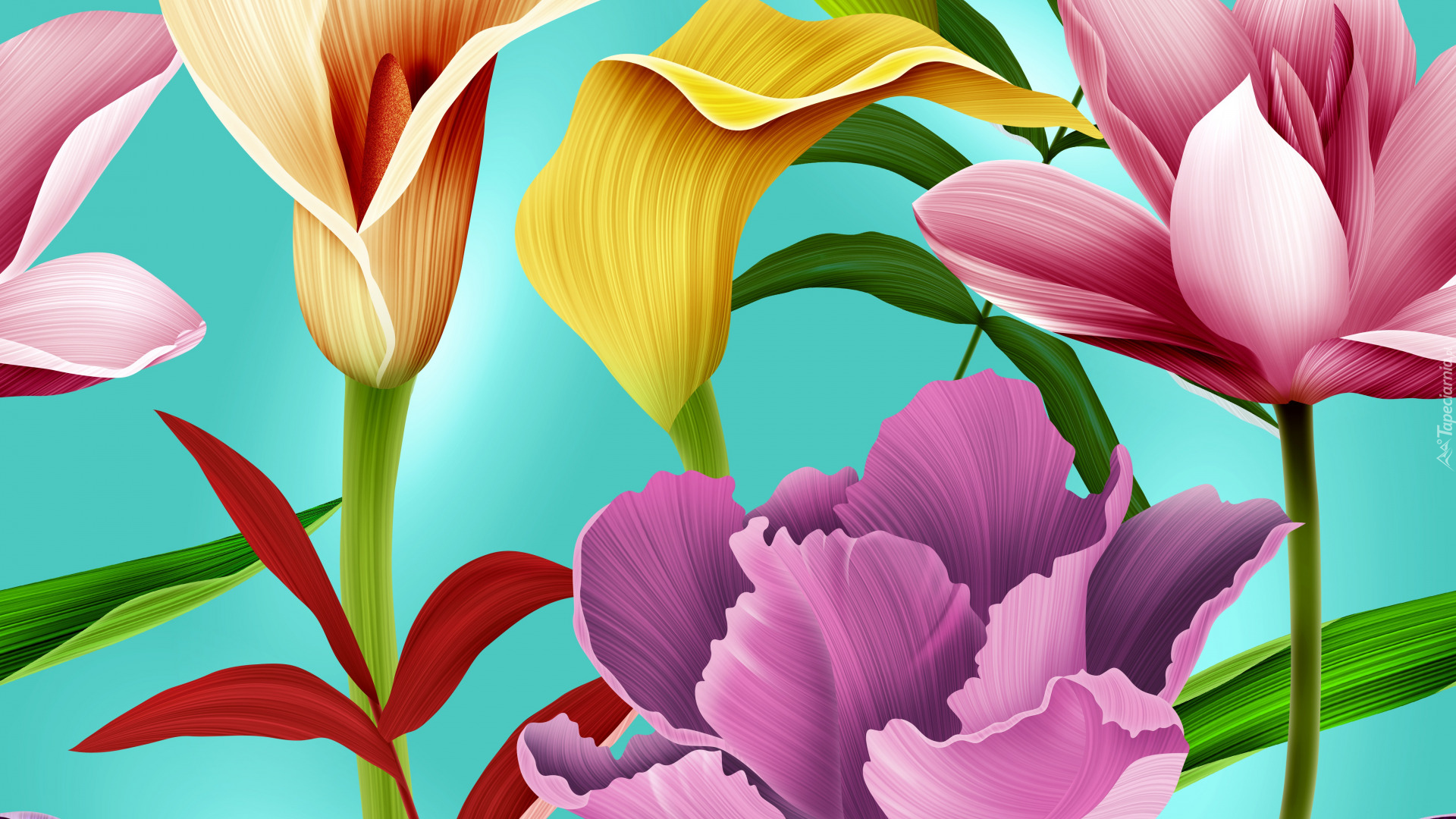 Edytor tapety: Kolorowe kwiaty na turkusowym tle w 2D