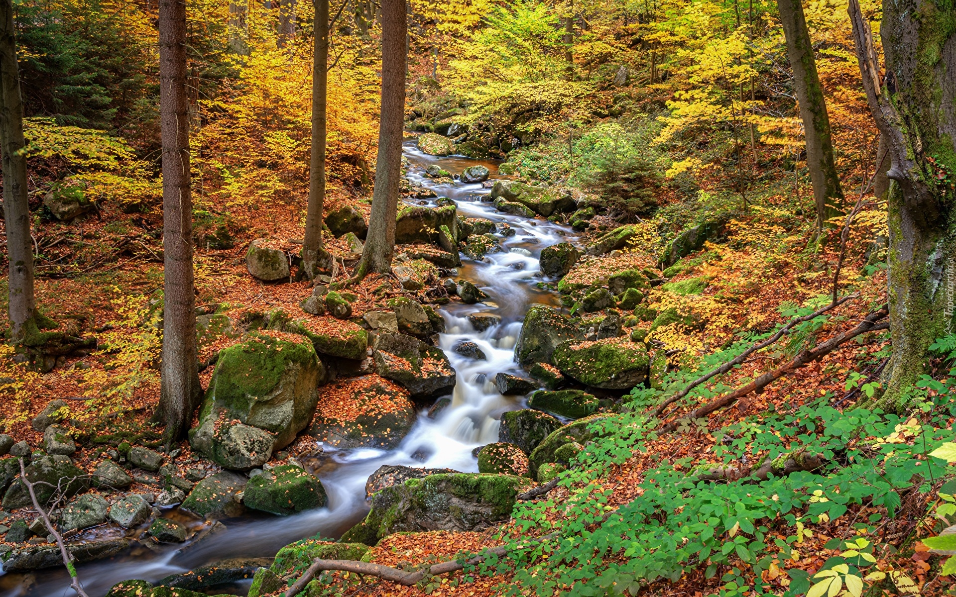 Edytor tapety: Rwący strumień w jesiennym lesie