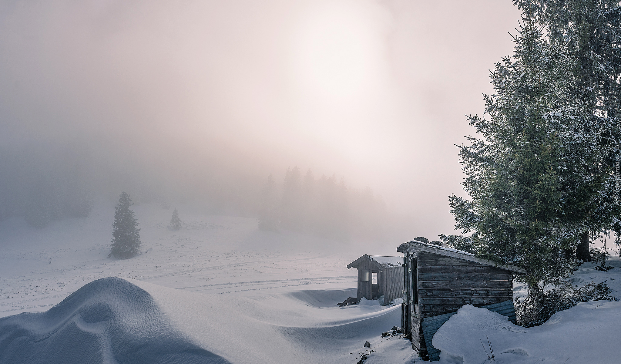 Edytor tapety: Zaśnieżone drewniane budki pod drzewami