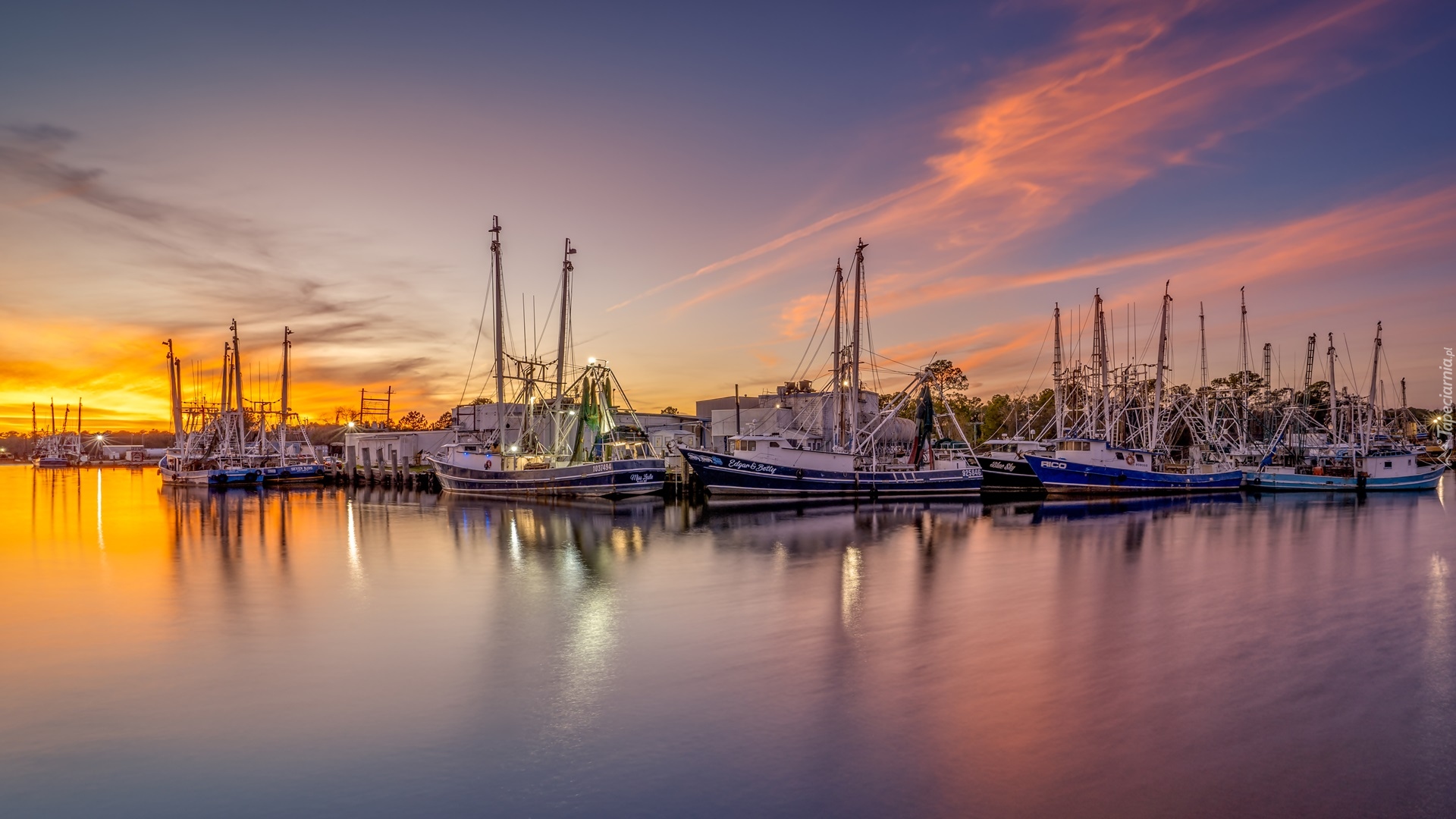 Edytor tapety: Żaglówki w porcie w blasku zachodzącego słońca