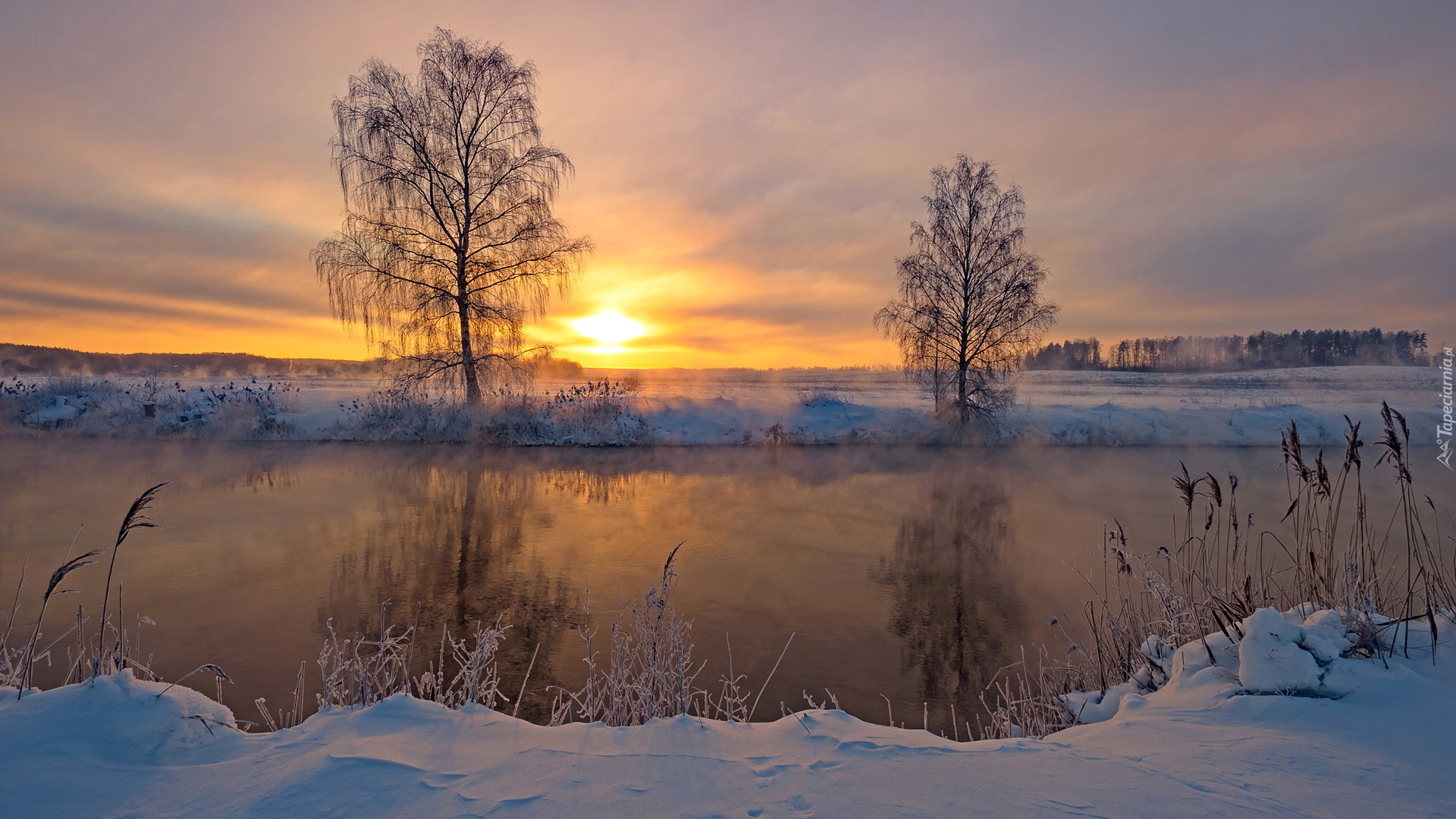 Edytor tapety: Drzewa i trawy nad brzegiem jeziora w śniegu