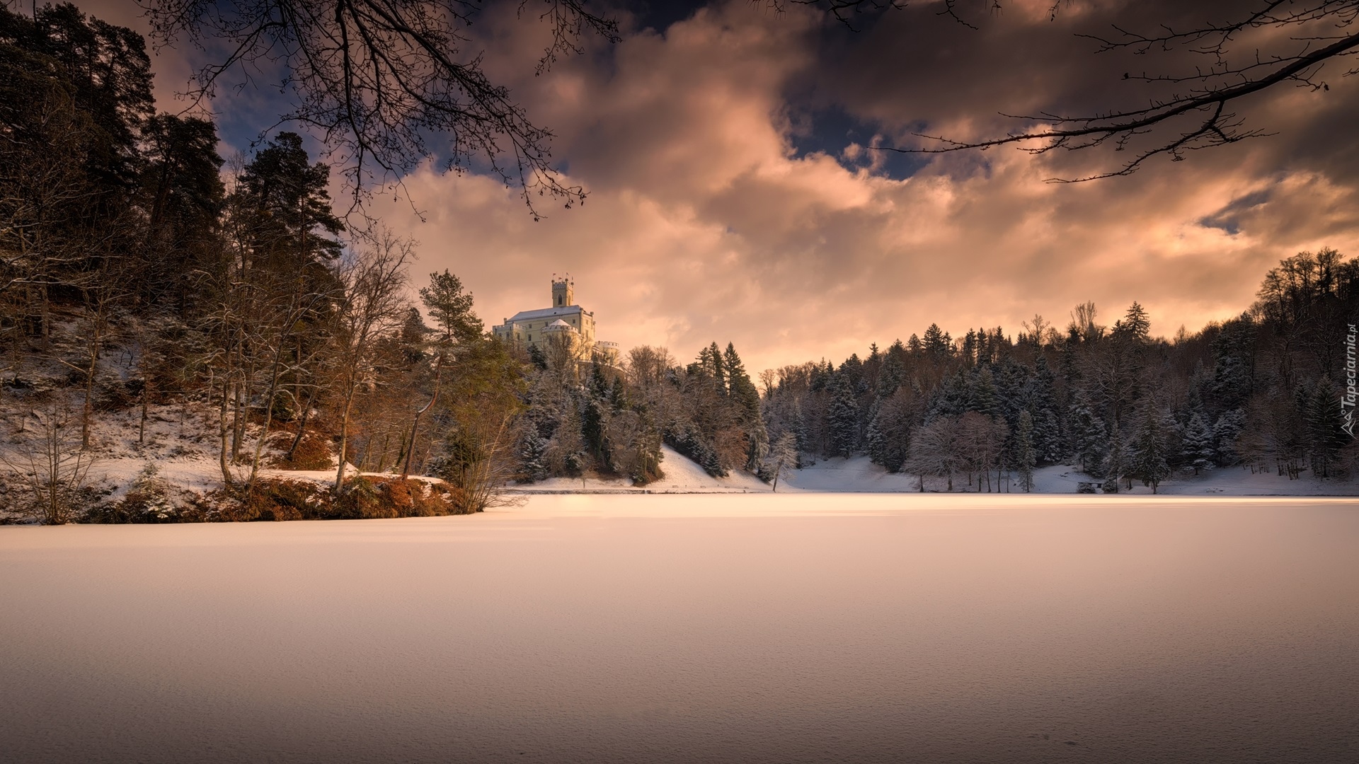 Edytor tapety: Zamek Trakoscan w Chorwacji nad zasypanym śniegiem jeziorem