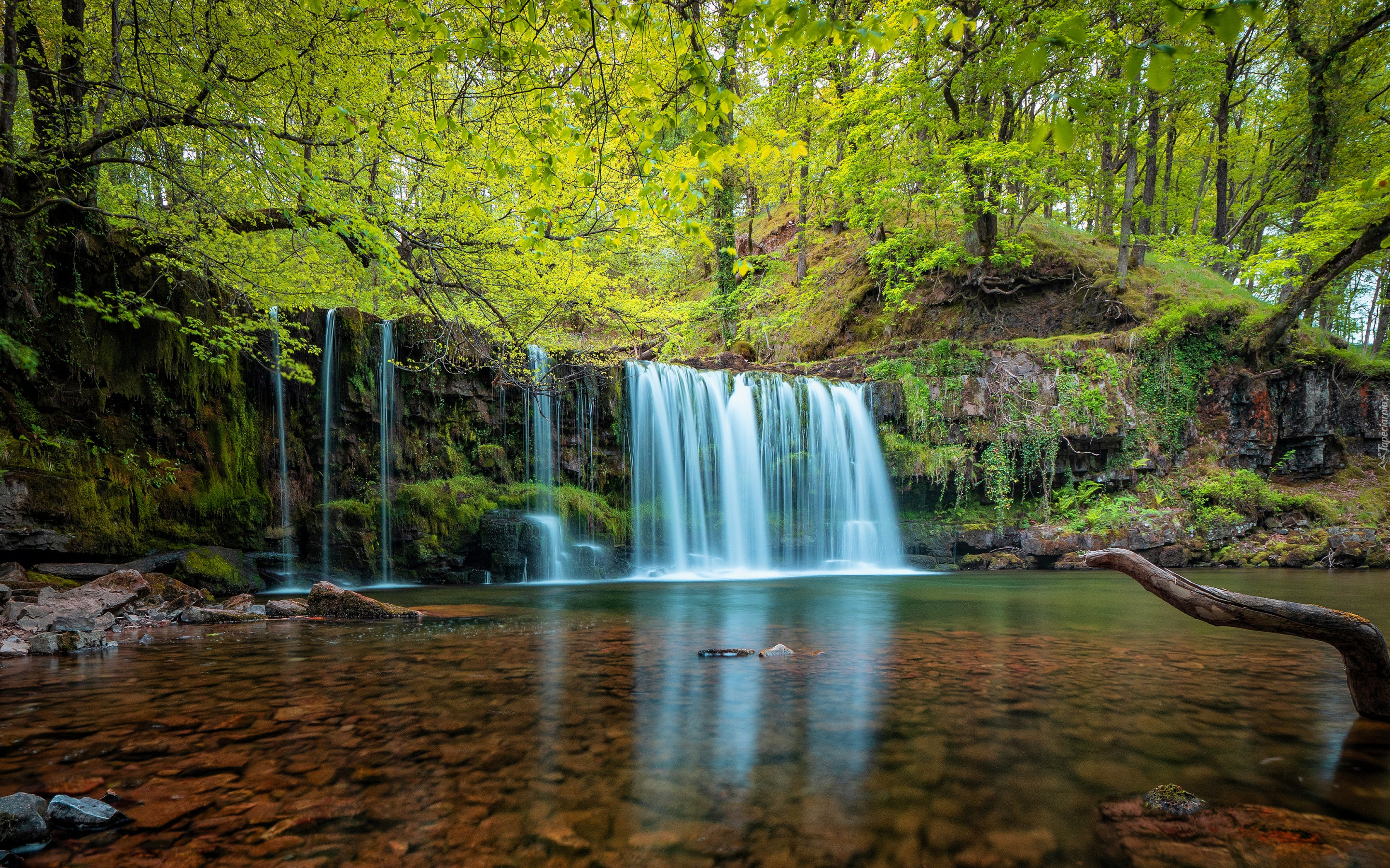 Edytor tapety: Wodospad pośród zielonych drzew w lesie