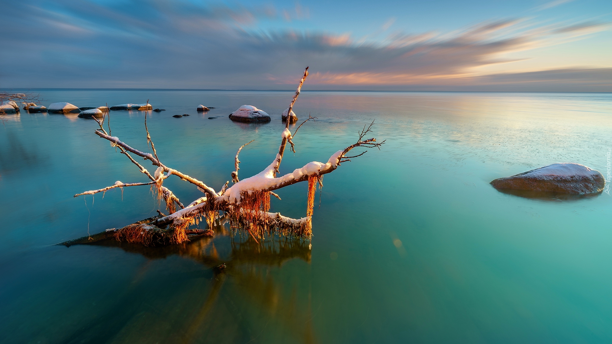 Edytor tapety: Ośnieżony konar i kamienie w Morzu Bałtyckim