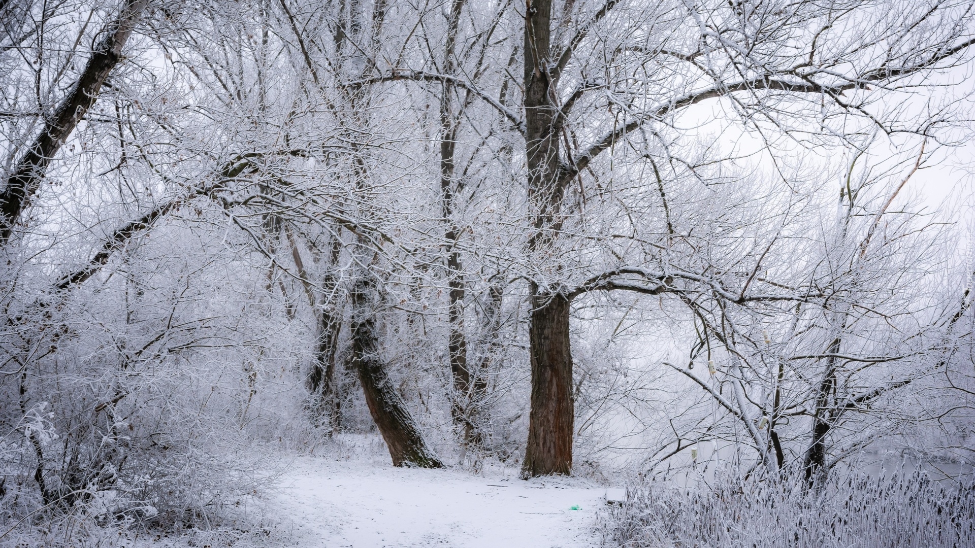 Edytor tapety: Ośnieżone drzewa i krzewy w lesie