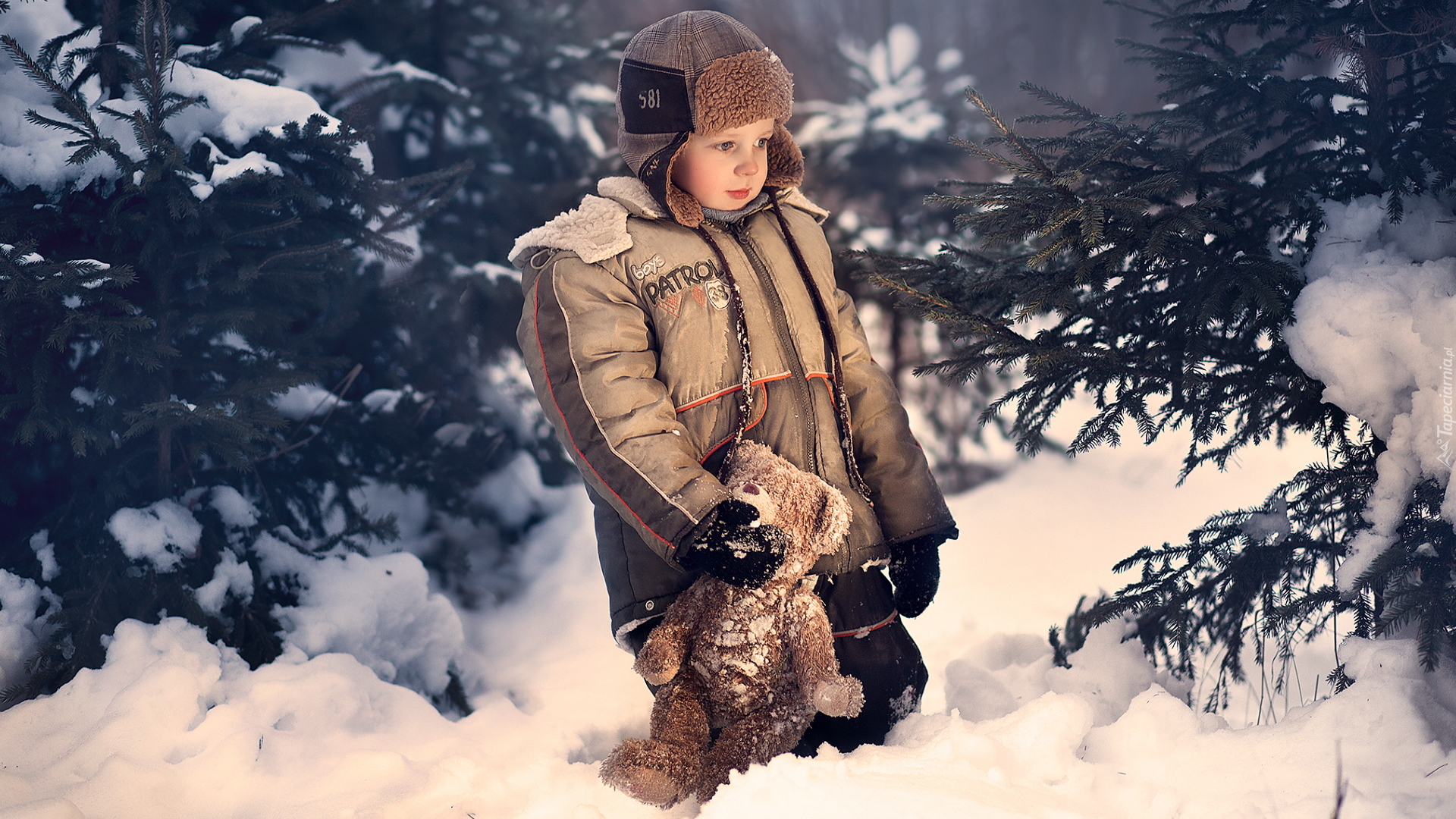 Edytor tapety: Chłopiec z pluszowym misiem w lesie