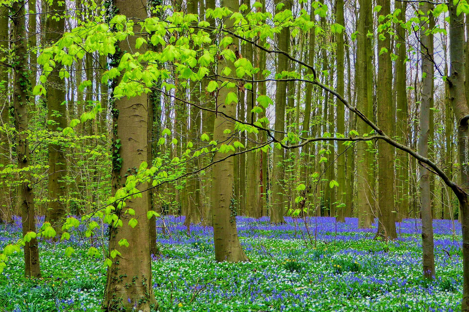 Edytor tapety: Zielone drzewa i kwiaty w wiosennym lesie
