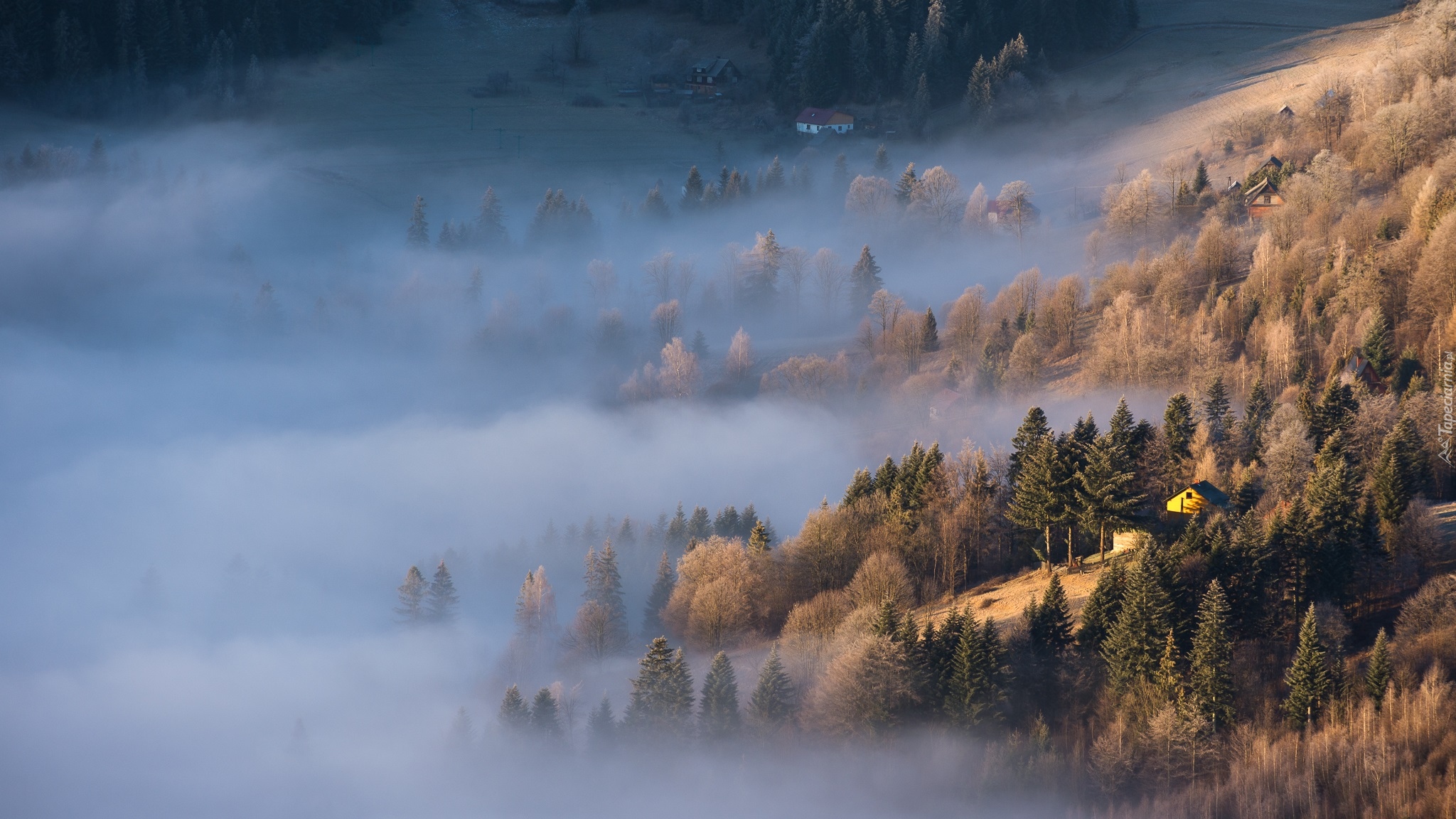 Edytor tapety: Lasy i domki na stoku we mgle