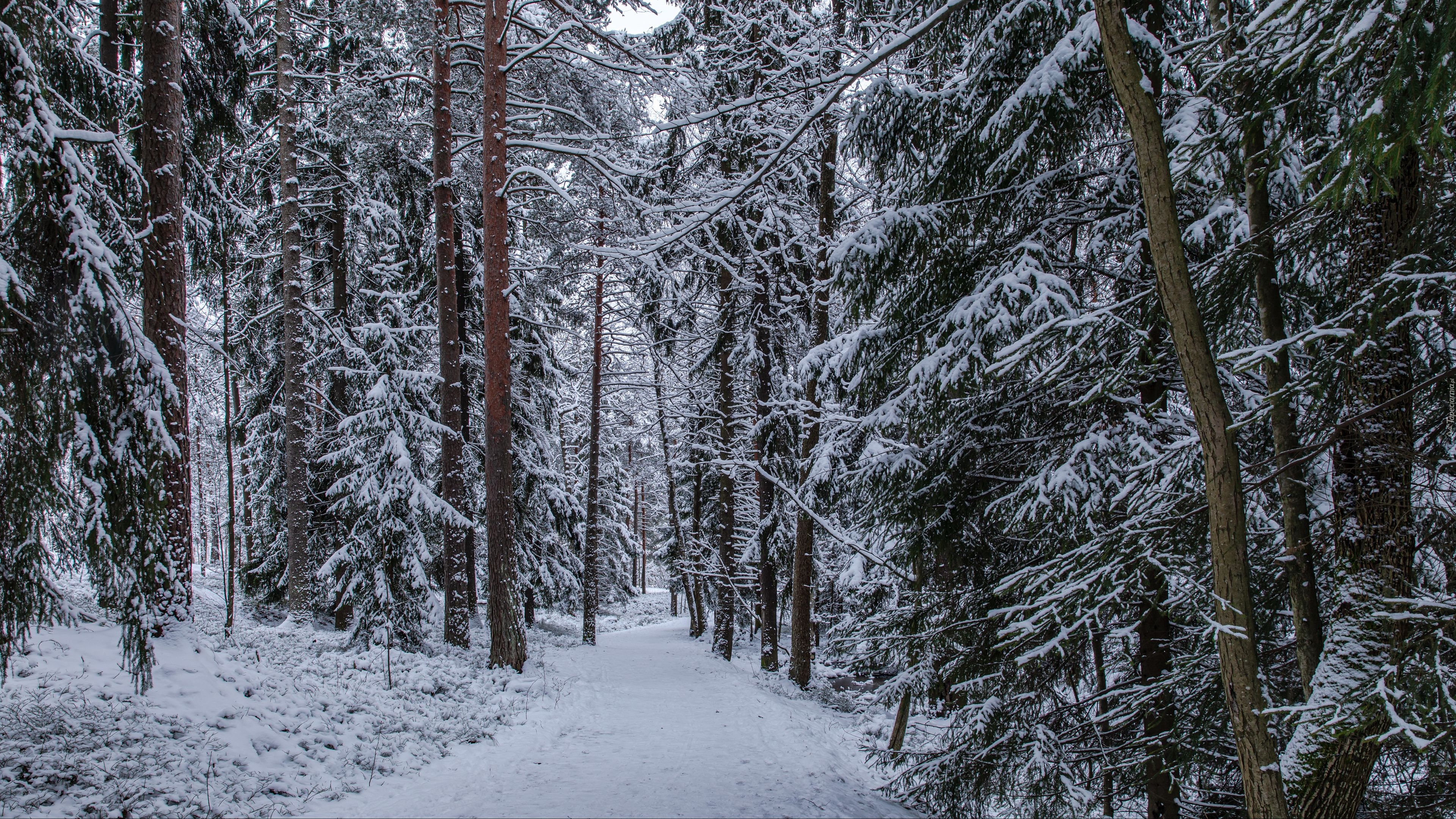 Edytor tapety: Ośnieżone drzewa przy leśnej ścieżce