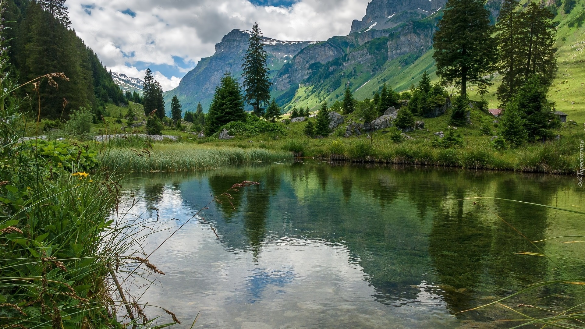Edytor tapety: Jezioro otoczone trawą i drzewami na tle gór