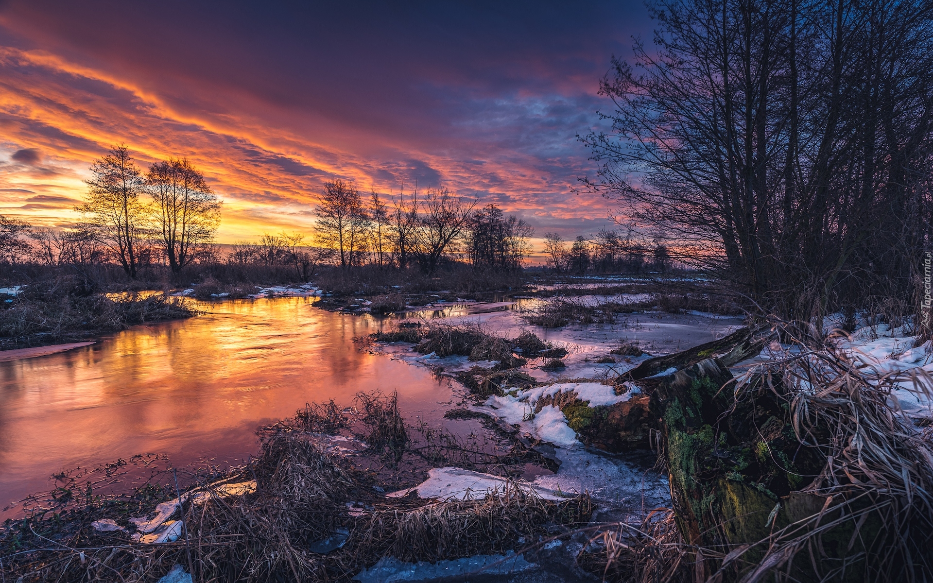 Edytor tapety: Ośnieżone trawy w rzece Mroga o zachodzie słońca
