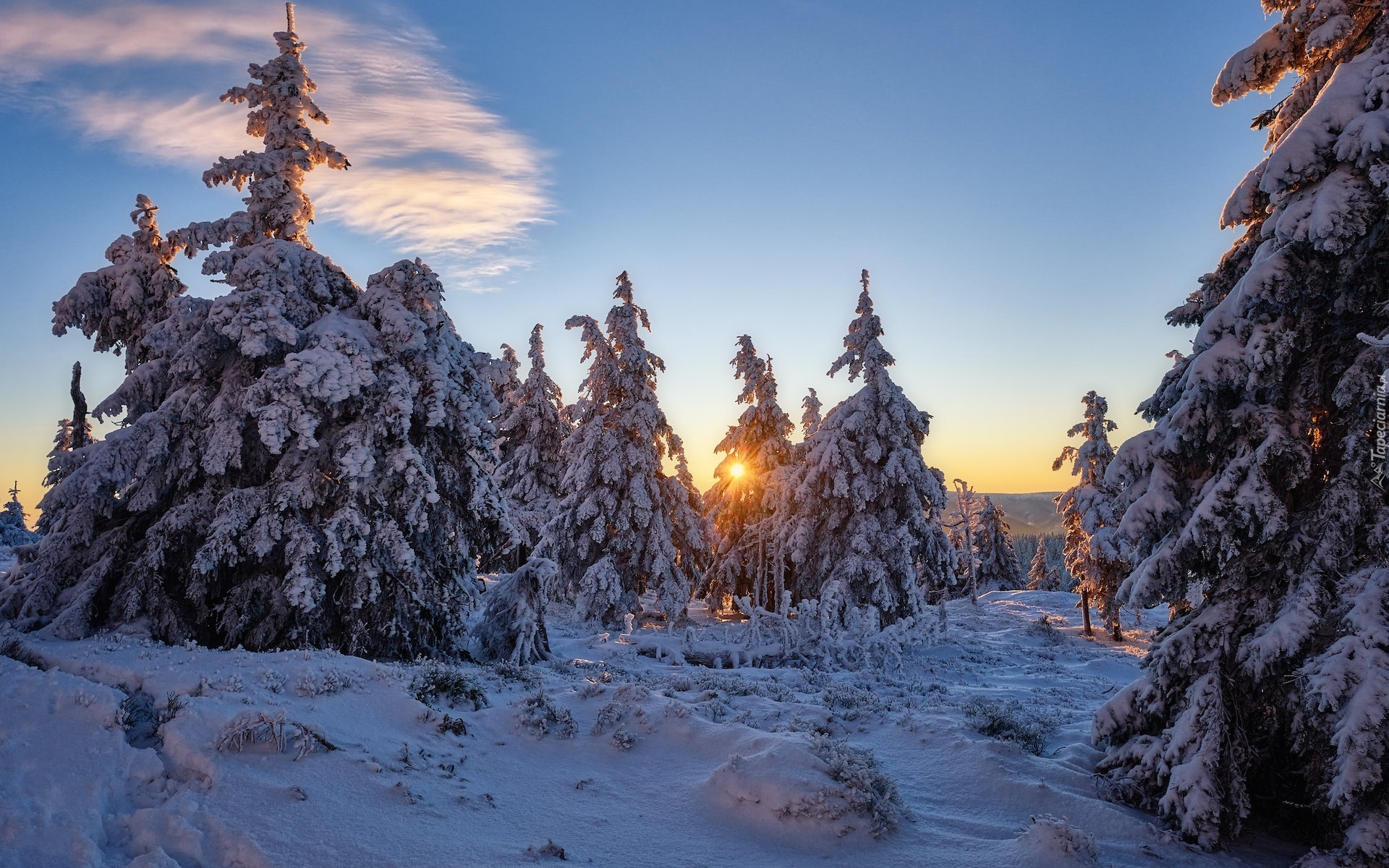 Edytor tapety: Promienie słońca w gałęziach ośnieżonych drzew
