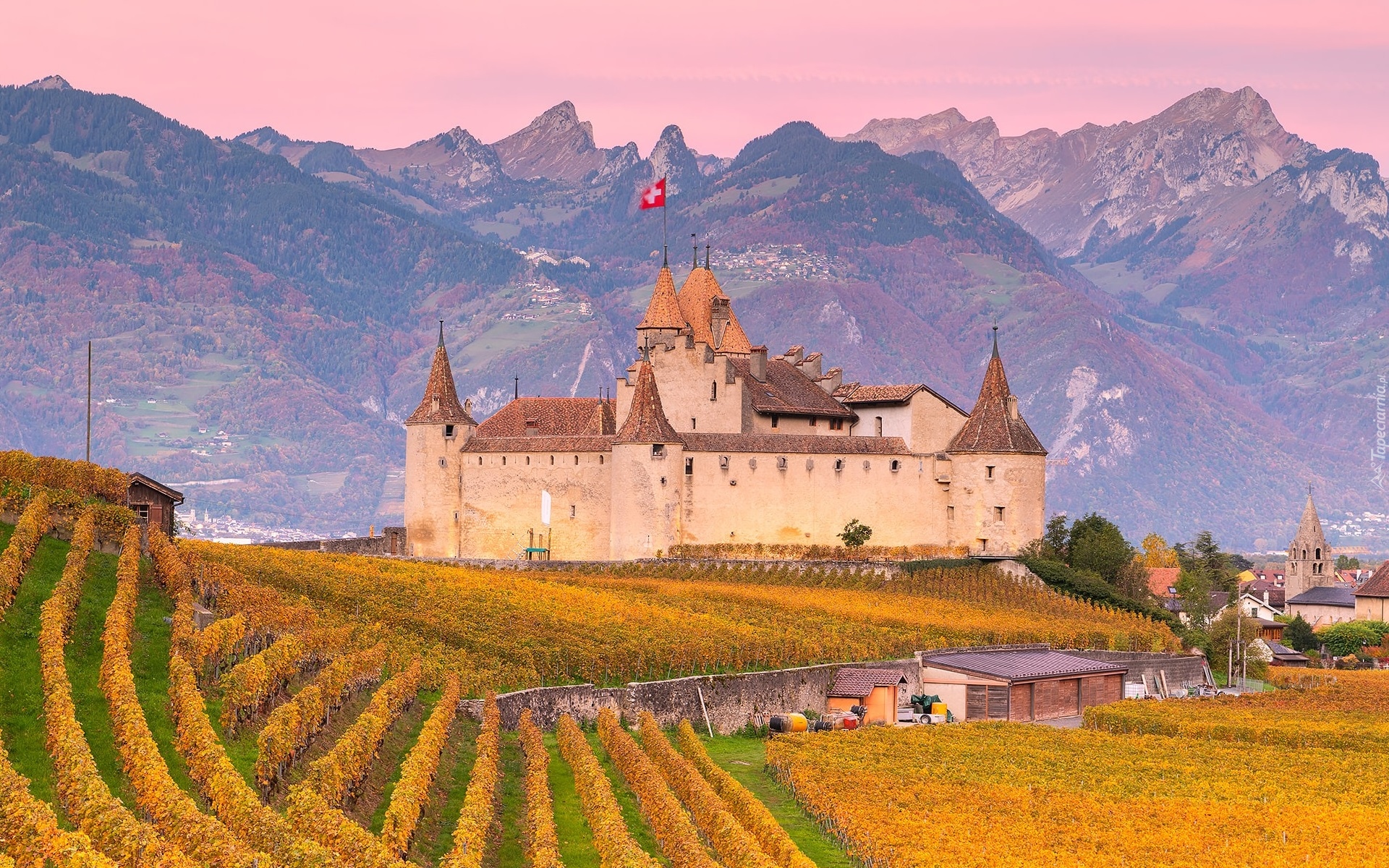 Edytor tapety: Zamek Aigle Castle pośród winnic na tle gór