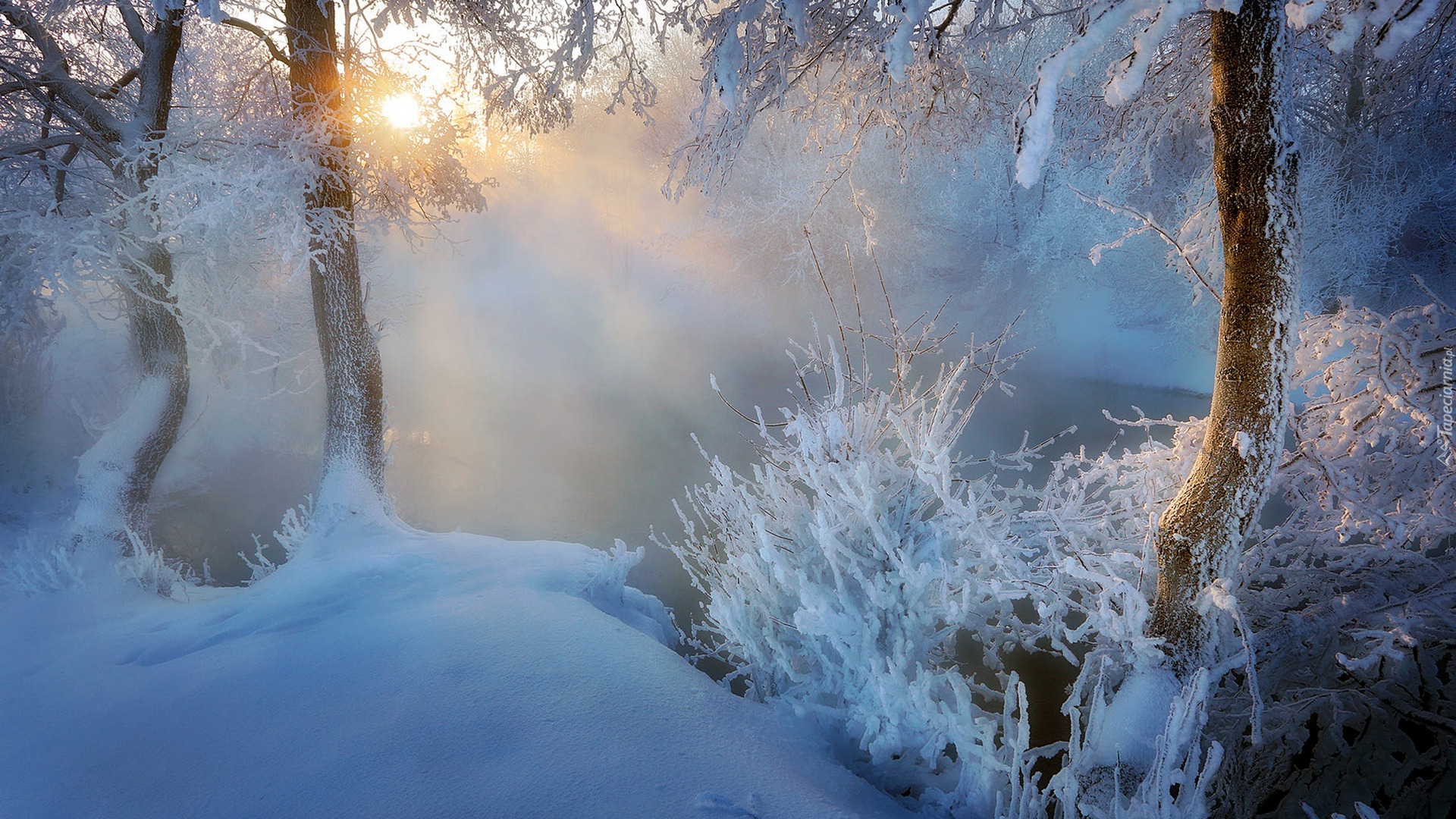 Edytor tapety: Ośnieżone drzewa i krzewy na brzegu zamglonej rzeki