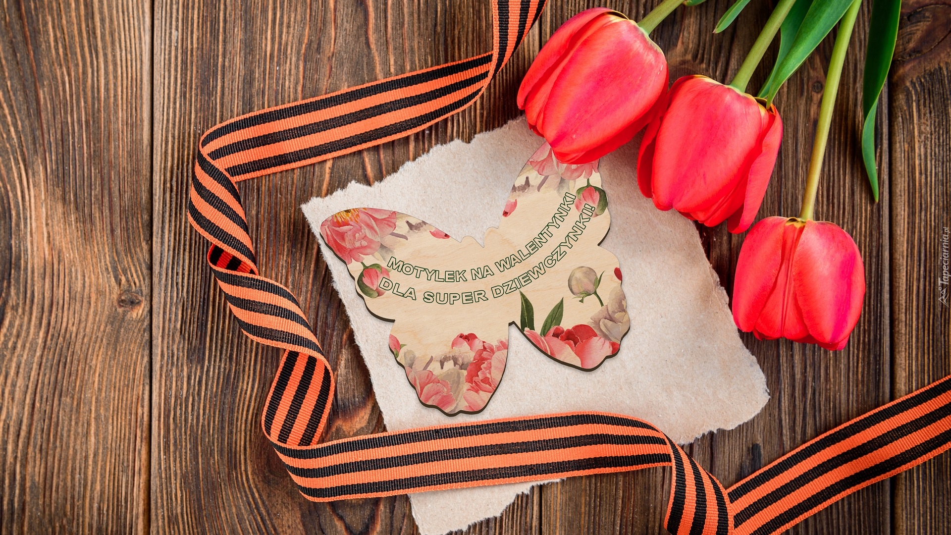 Edytor tapety: Walentynkowe życzenia obok tulipanów i wstążki na deskach