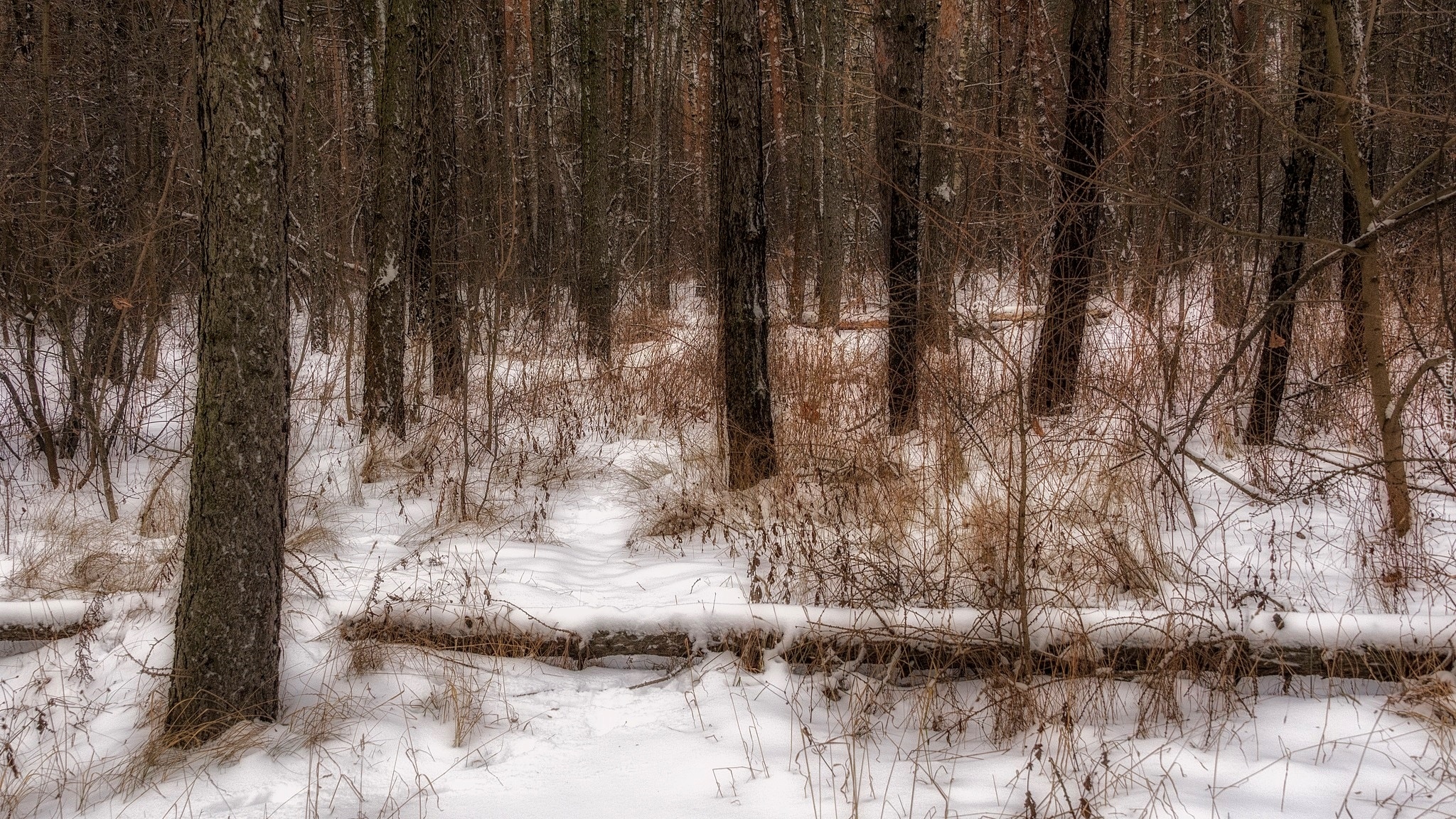 Edytor tapety: Sucha trawa pod drzewami w śniegu