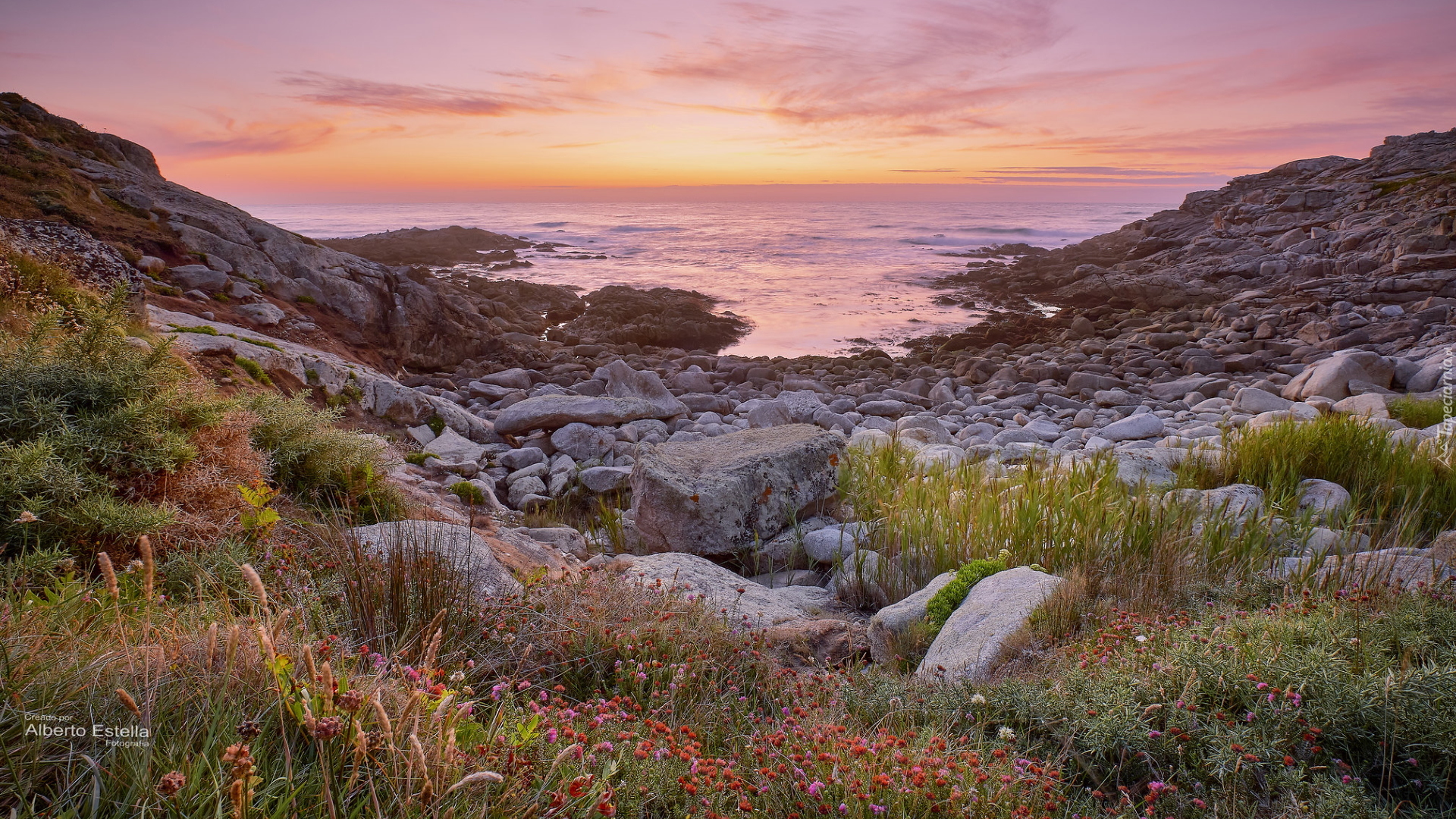 Edytor tapety: Kolorowa roślinność na kamienistym brzegu morza w Galicji
