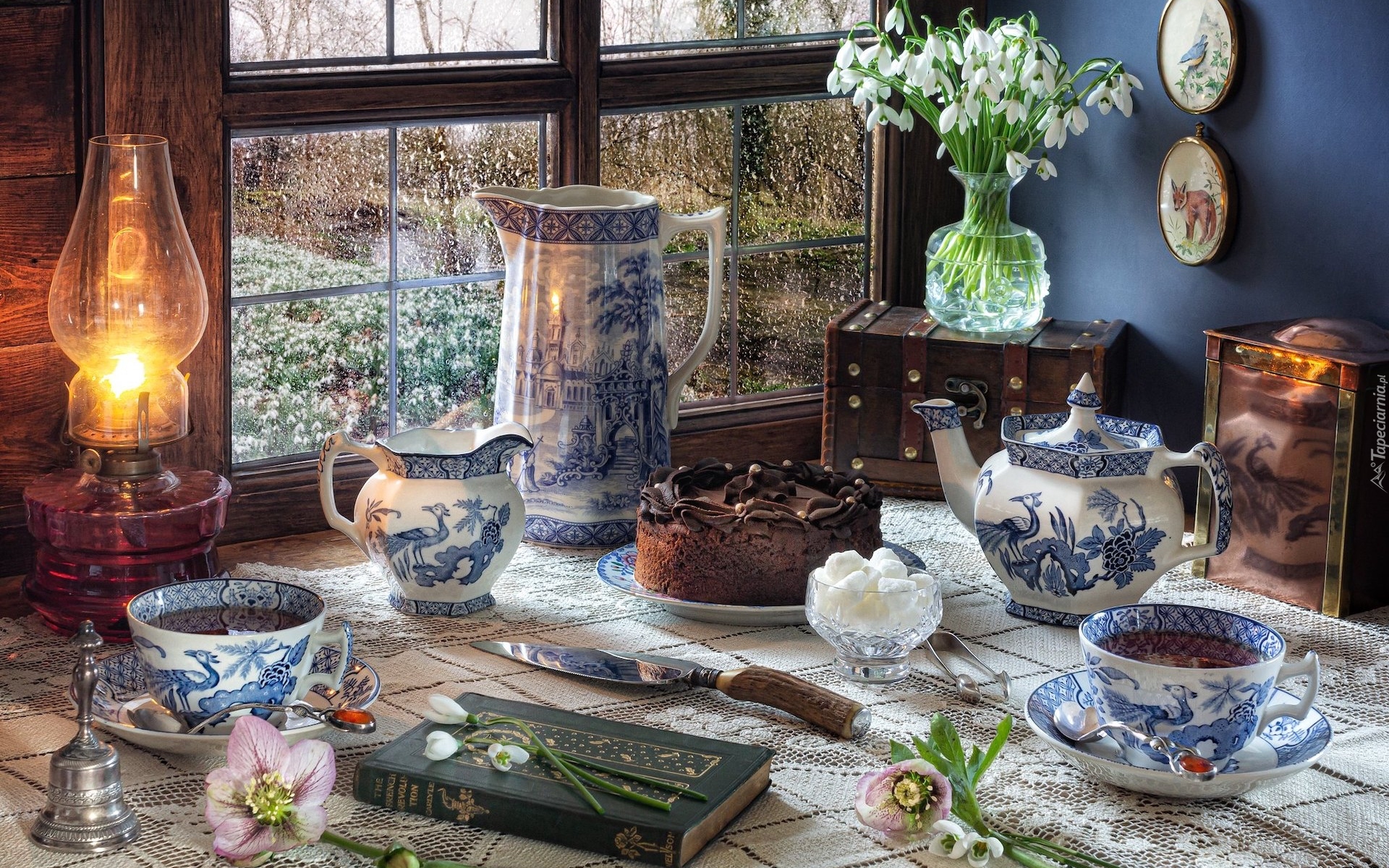 Edytor tapety: Kompozycja z bukietem przebiśniegów i tortem przy oknie