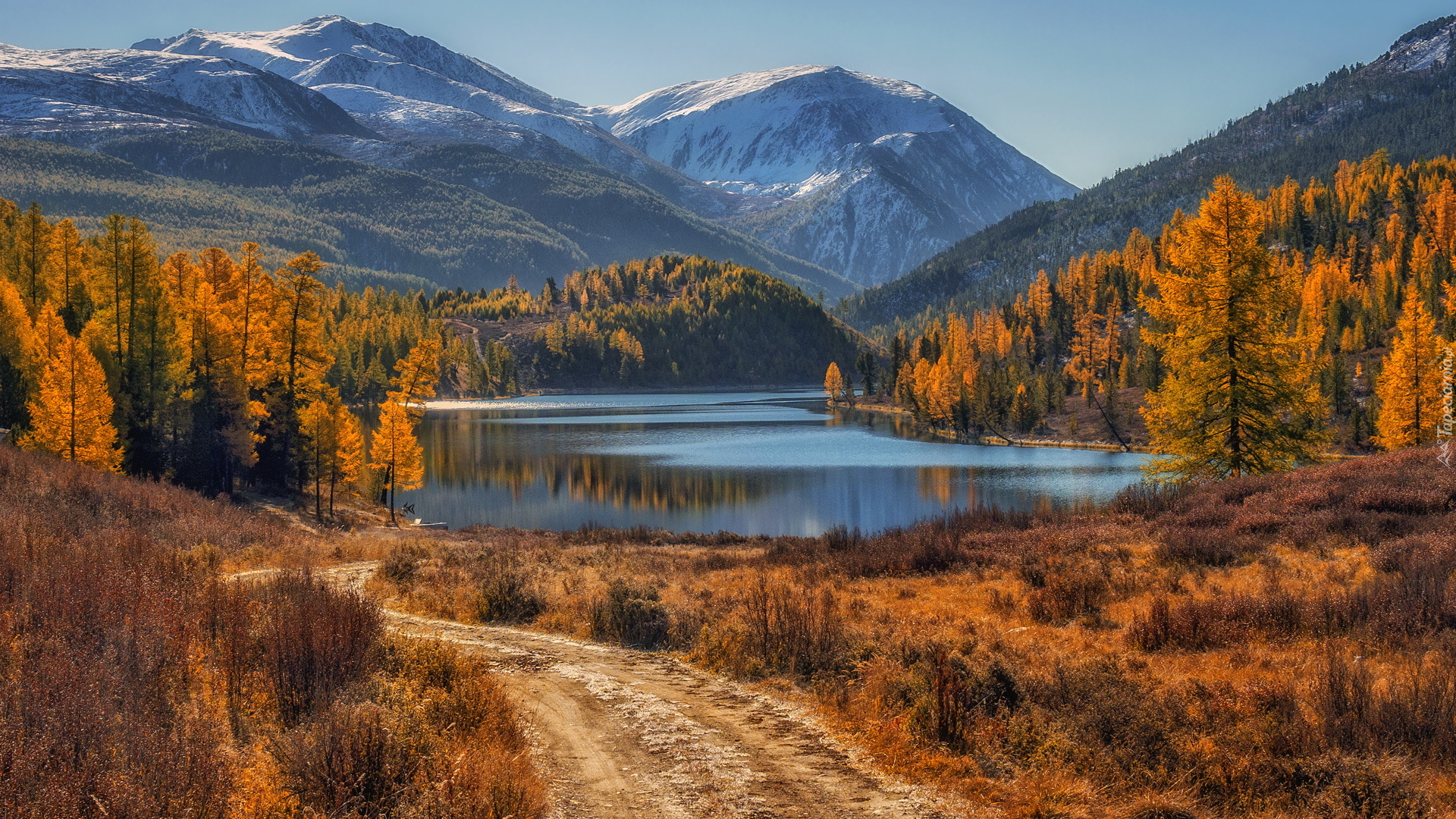 Edytor tapety: Jezioro Kok-Kol otoczone jesiennymi drzewami