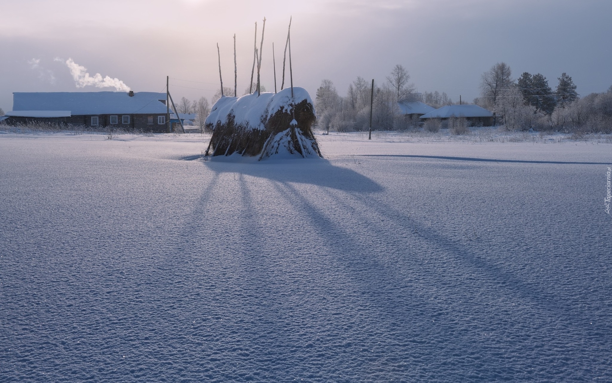 Edytor tapety: Ośnieżony stóg siana i domy