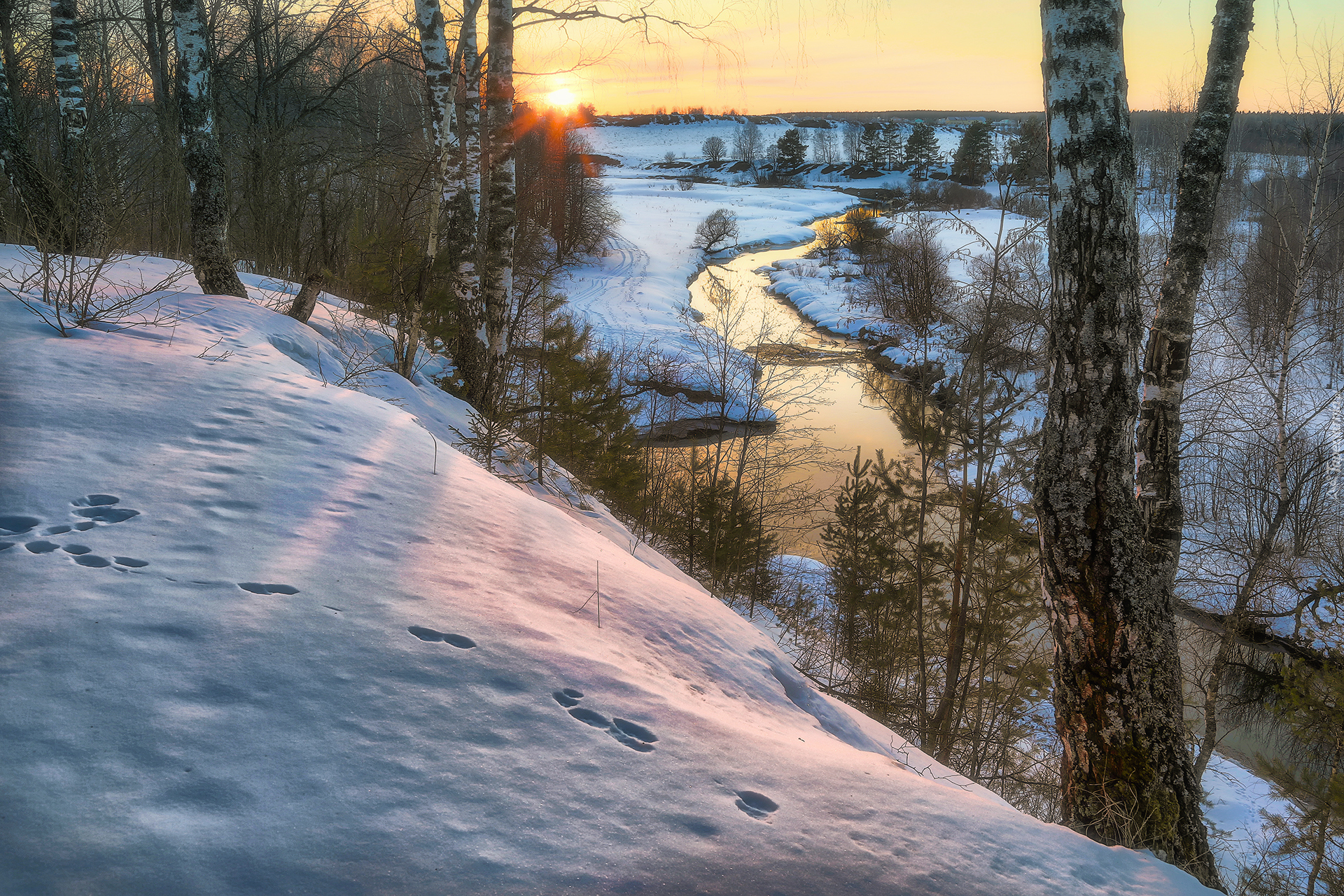 Edytor tapety: Ślady na zaśnieżonej skarpie nad rzeką