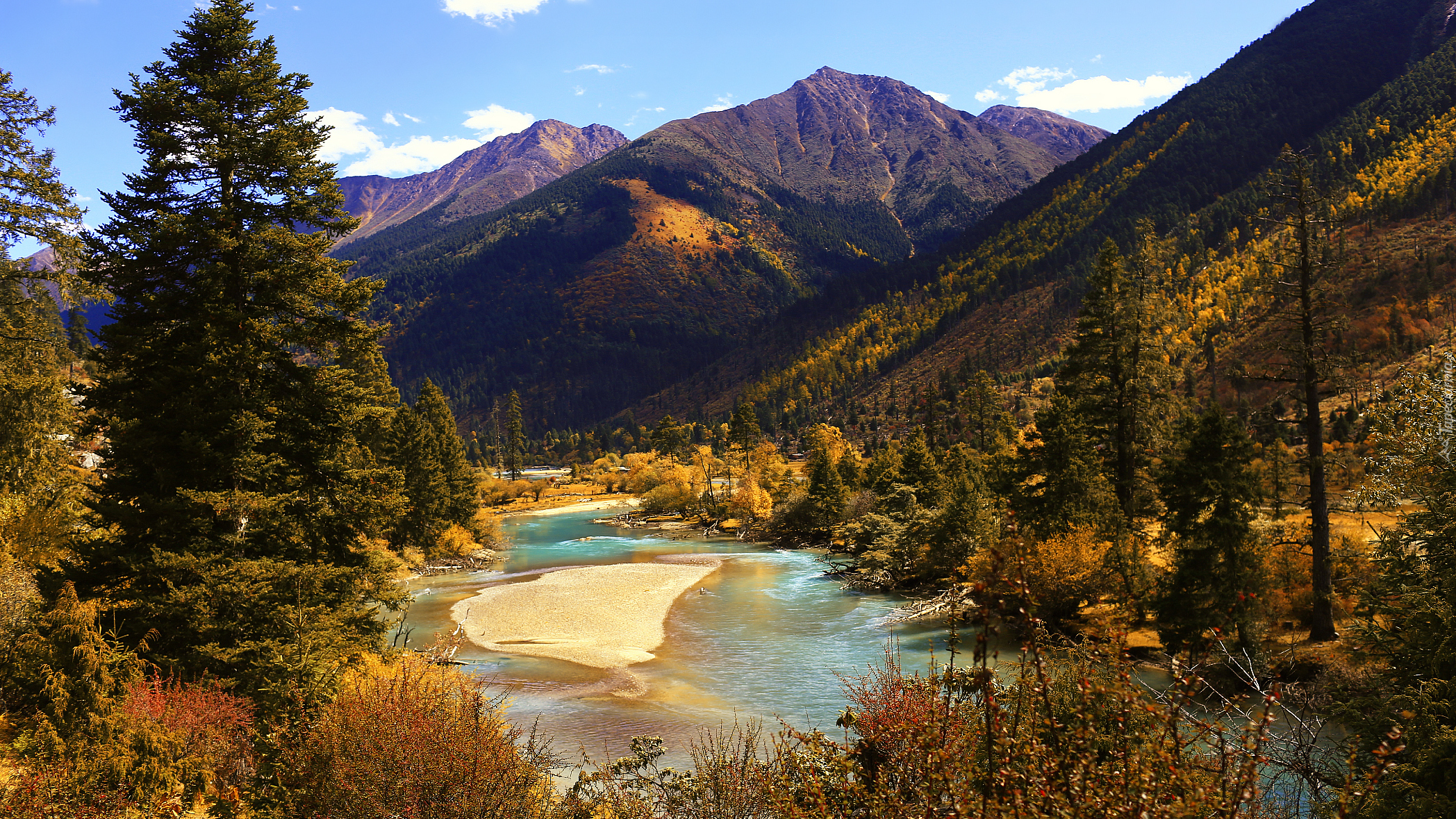 Edytor tapety: Drzewa nad szeroką górską rzeką