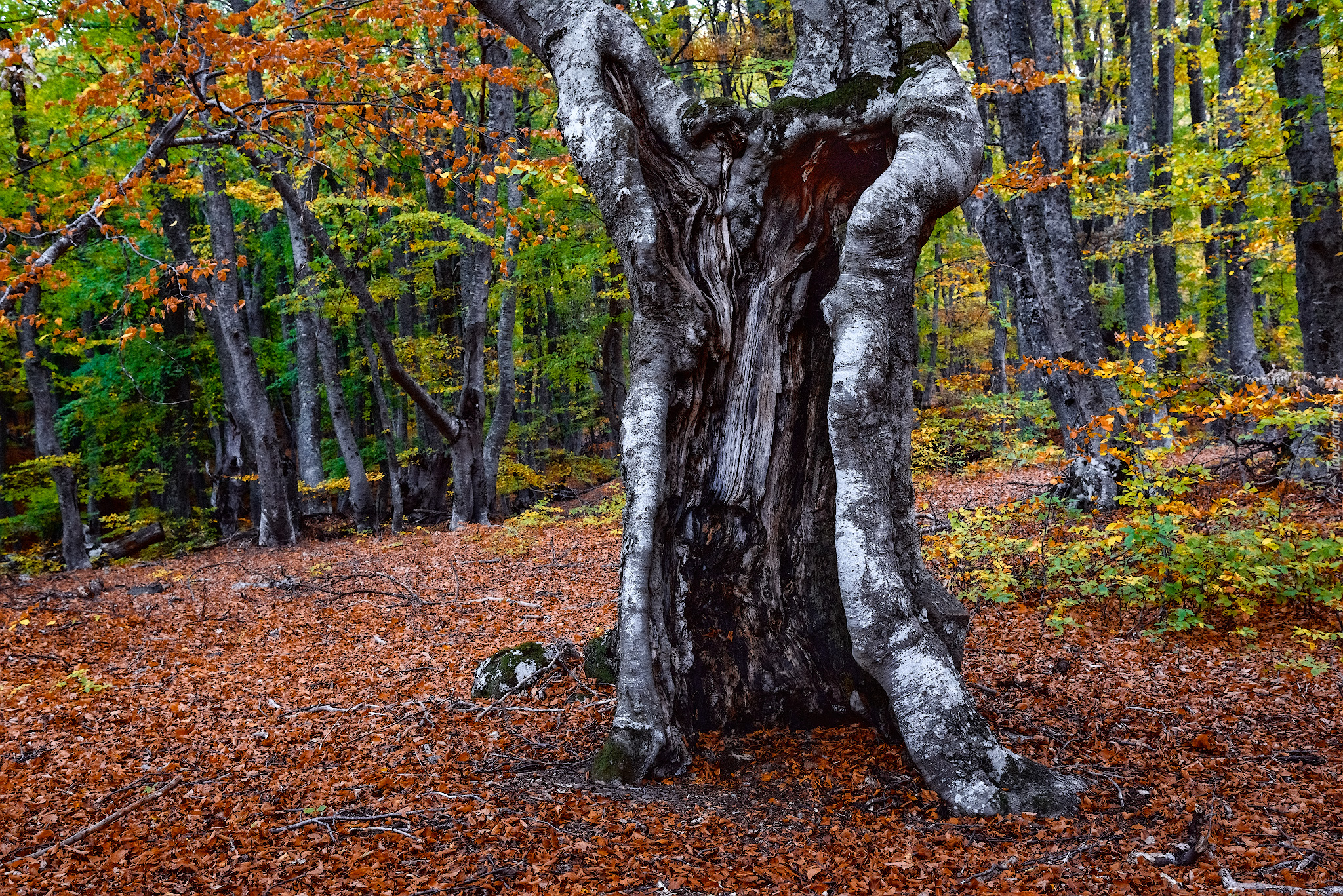 Edytor tapety: Pęknięty pień drzewa w jesiennym lesie