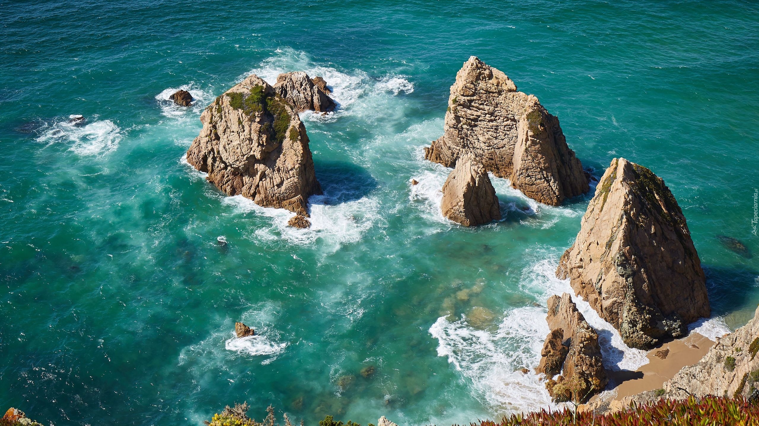 Edytor tapety: Wysokie skały przy brzegu turkusowego morza