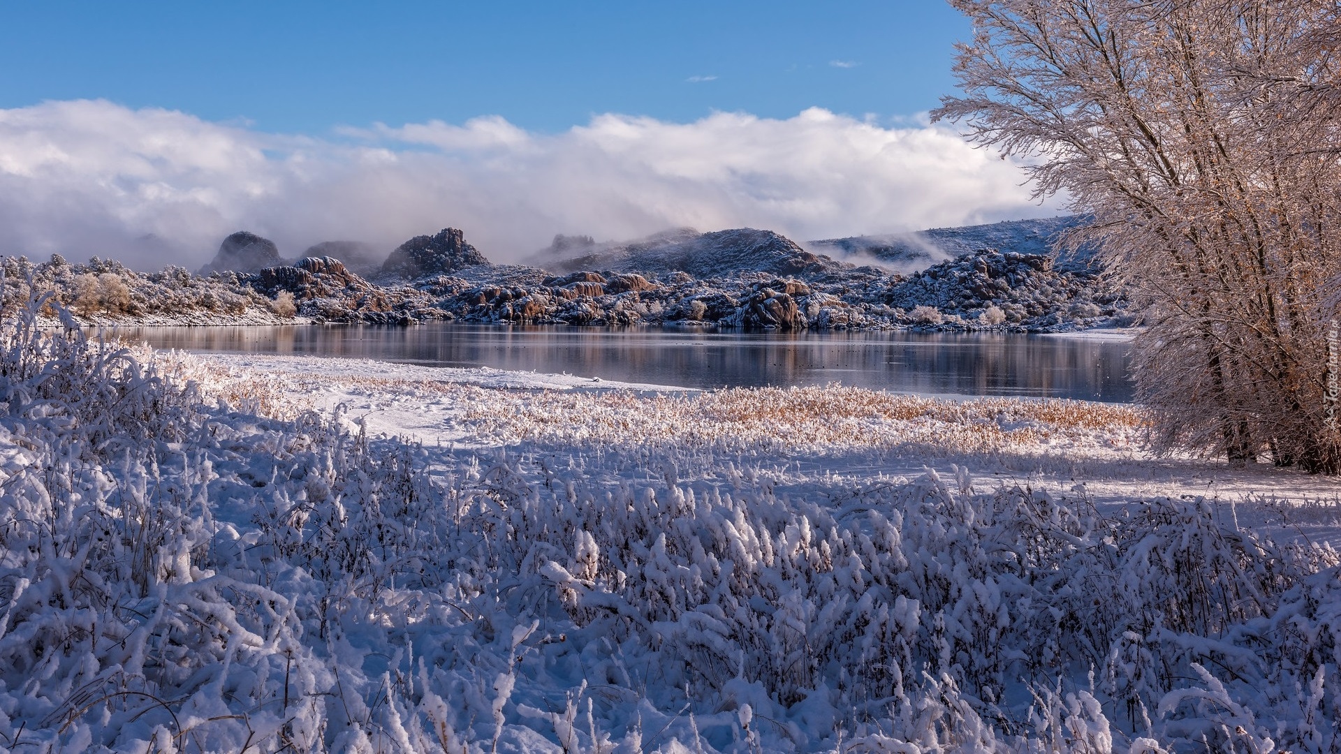 Edytor tapety: Ośnieżone rośliny na brzegu górskiego jeziora
