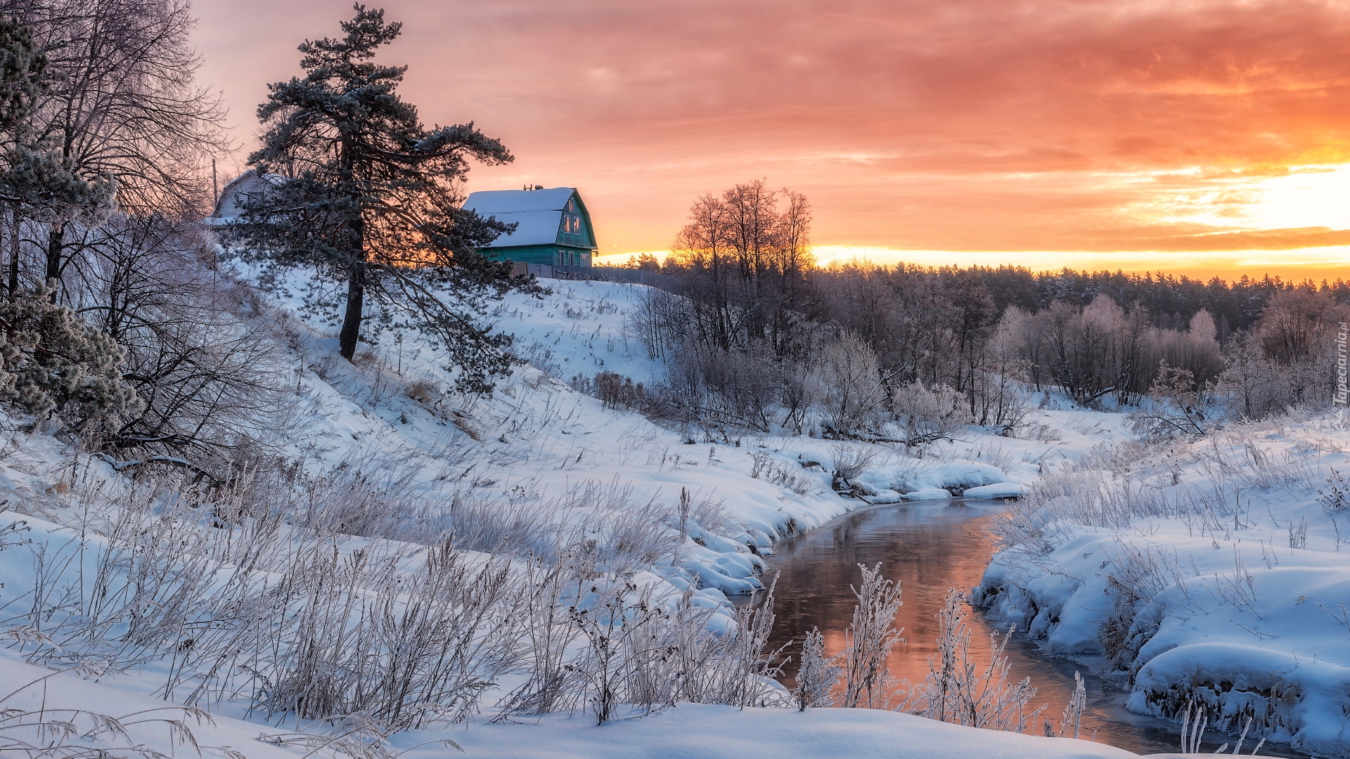 Edytor tapety: Dom na skarpie i ośnieżone rośliny nad rzeką