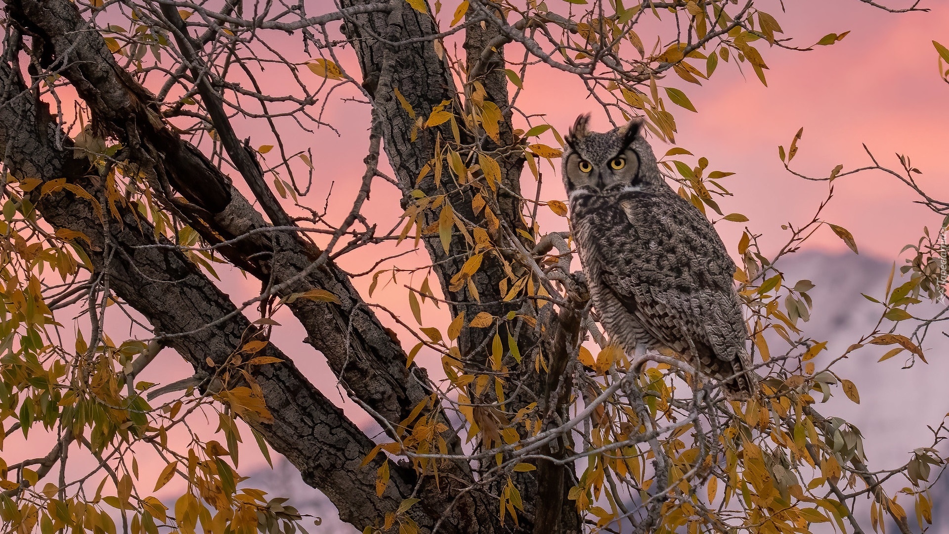Edytor tapety: Puchacz wirginijski na liściastych gałązkach