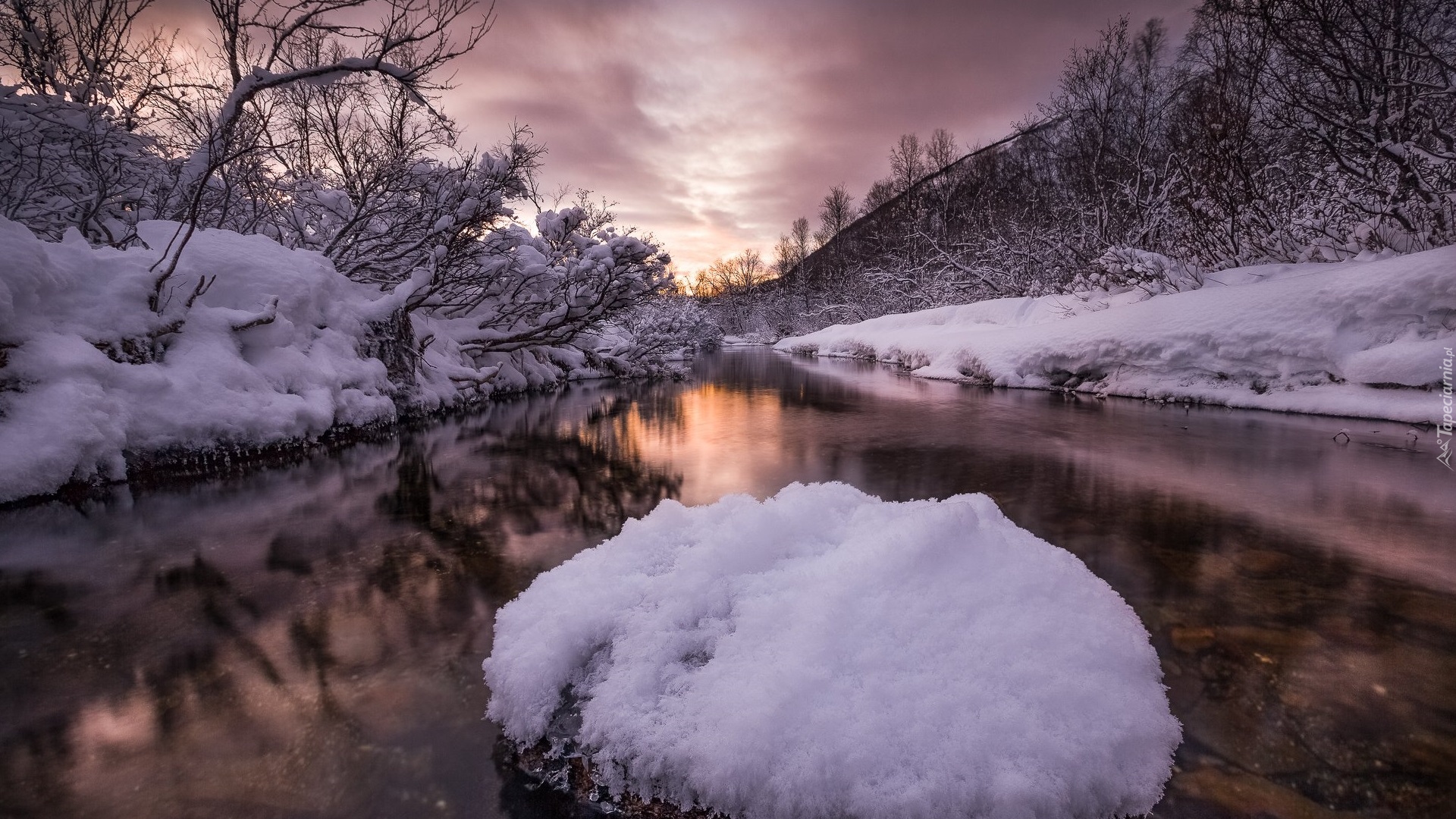 Edytor tapety: Drzewa w śniegu na brzegach rzeki