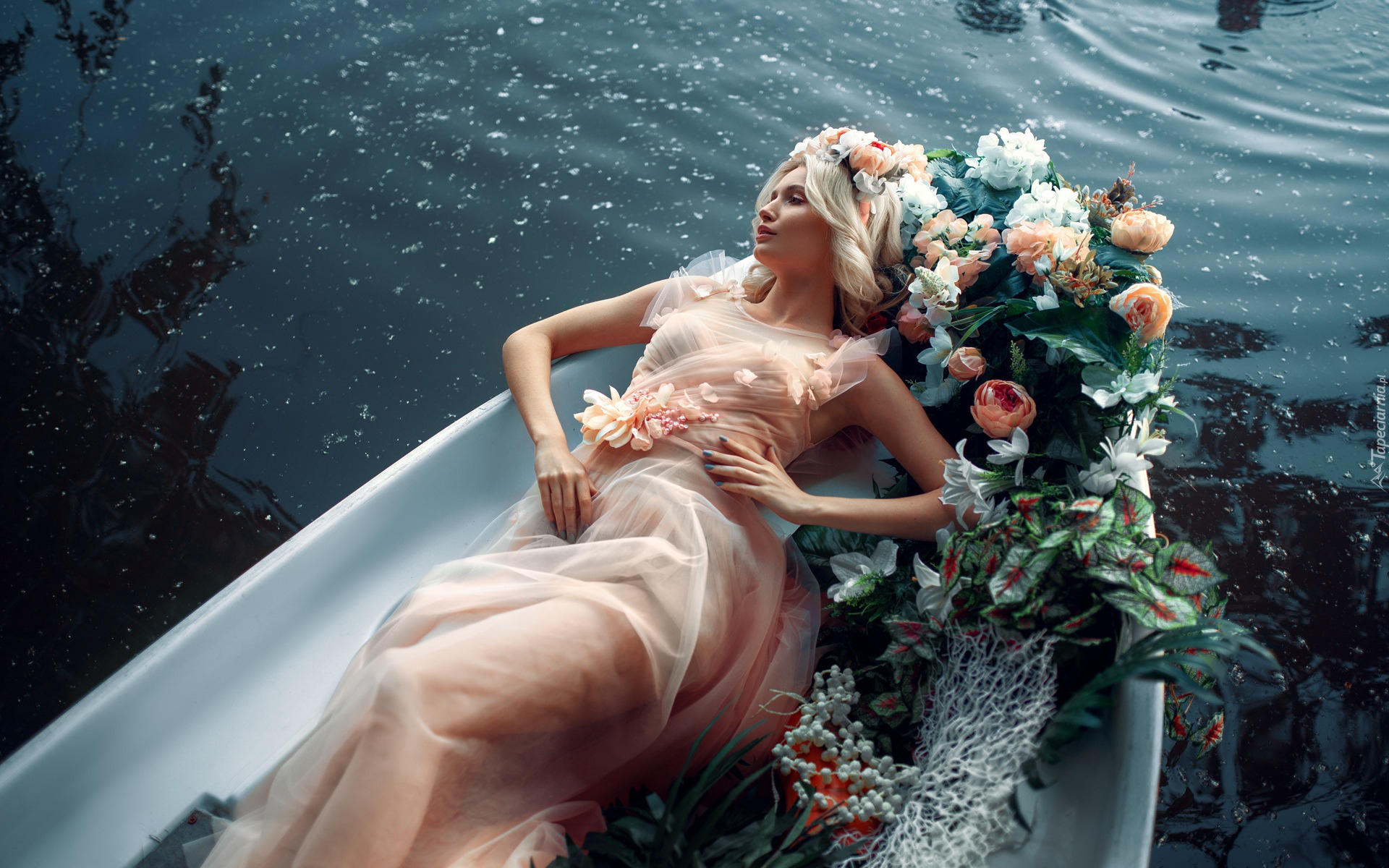 Edytor tapety: Kobieta obok kwiatów w łódce