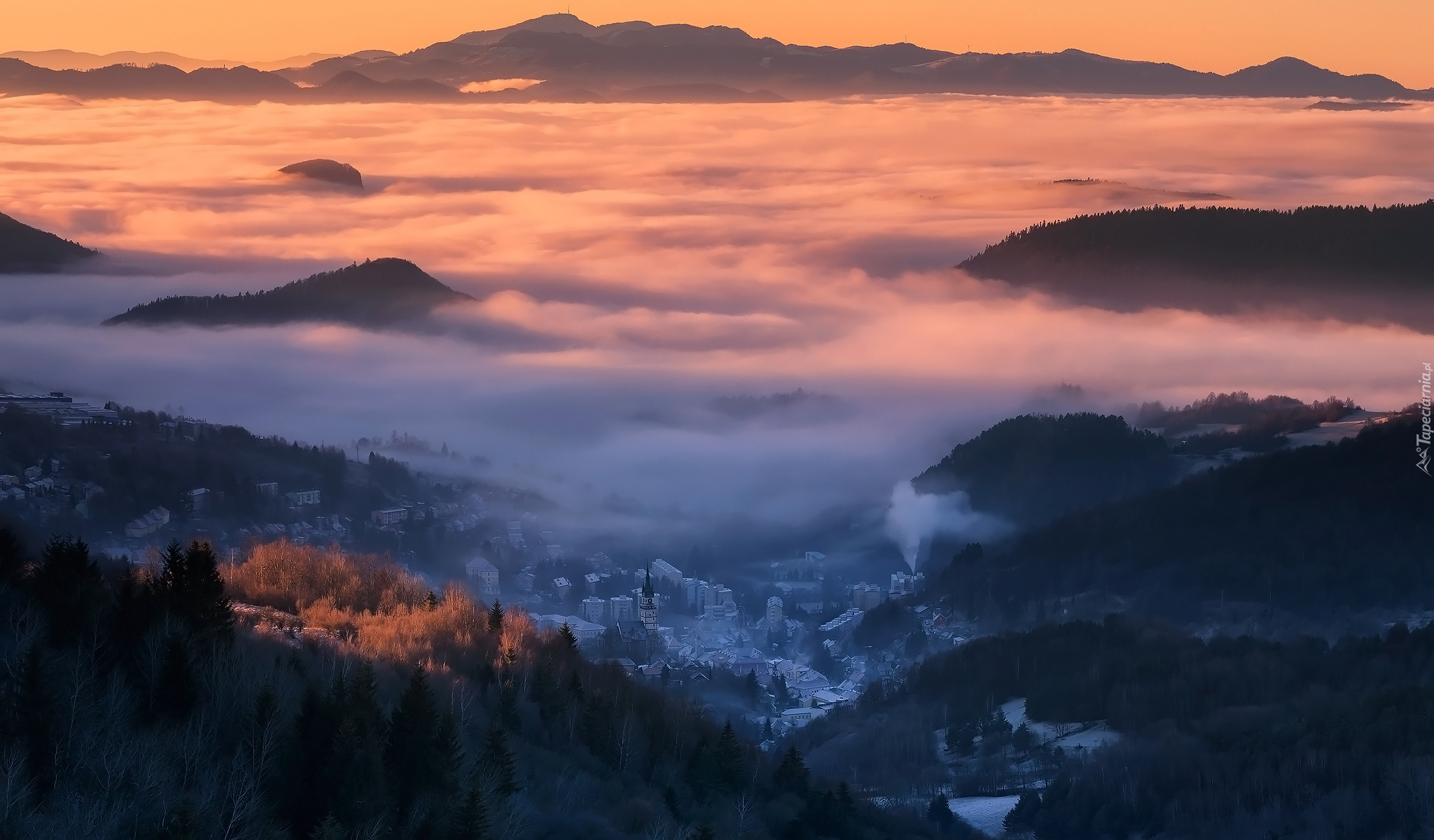 Edytor tapety: Miasto w dolinie spowitej gęstą mgłą