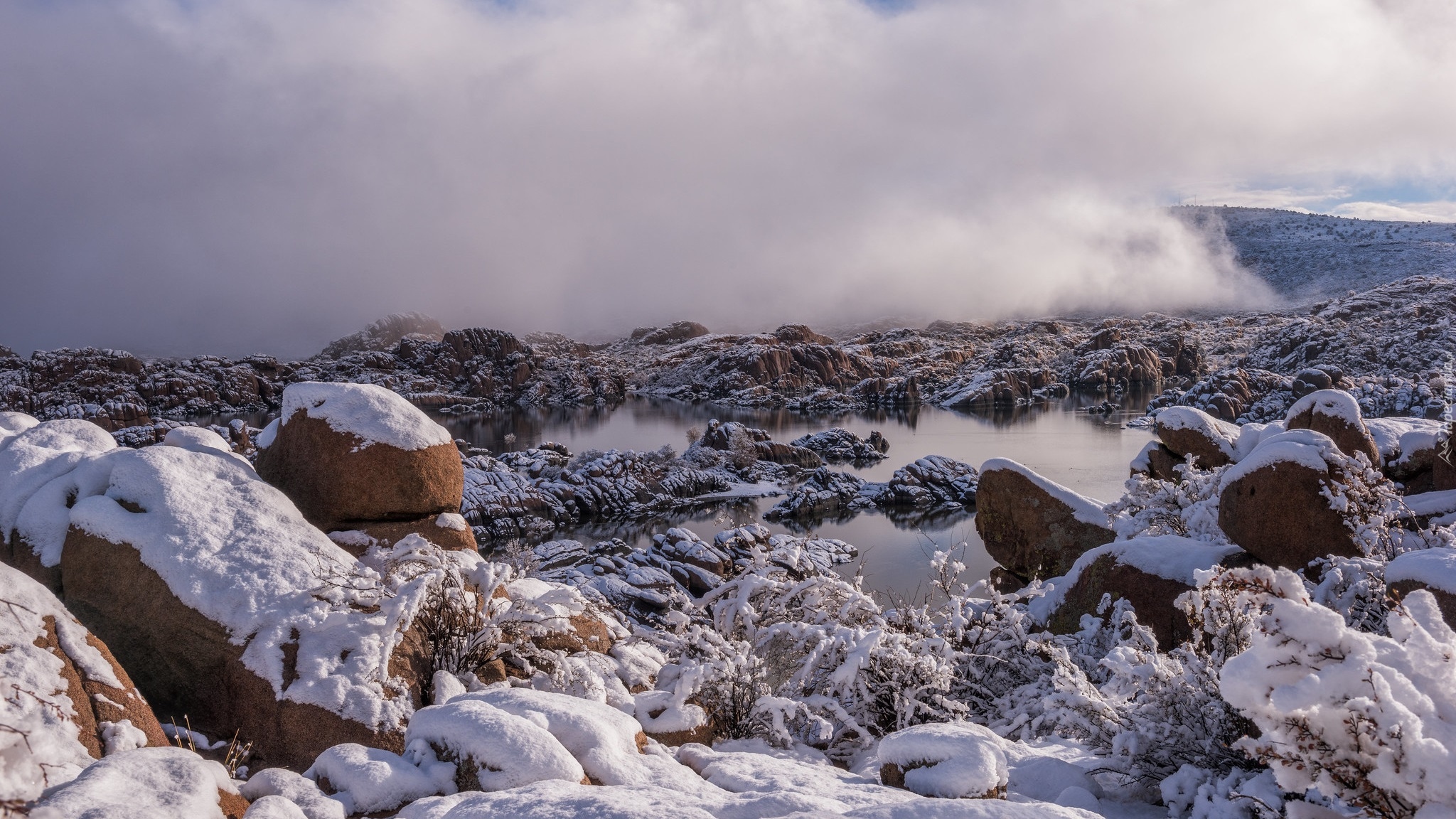 Edytor tapety: Ośnieżone kamienie nad jeziorem na tle gęstej mgły