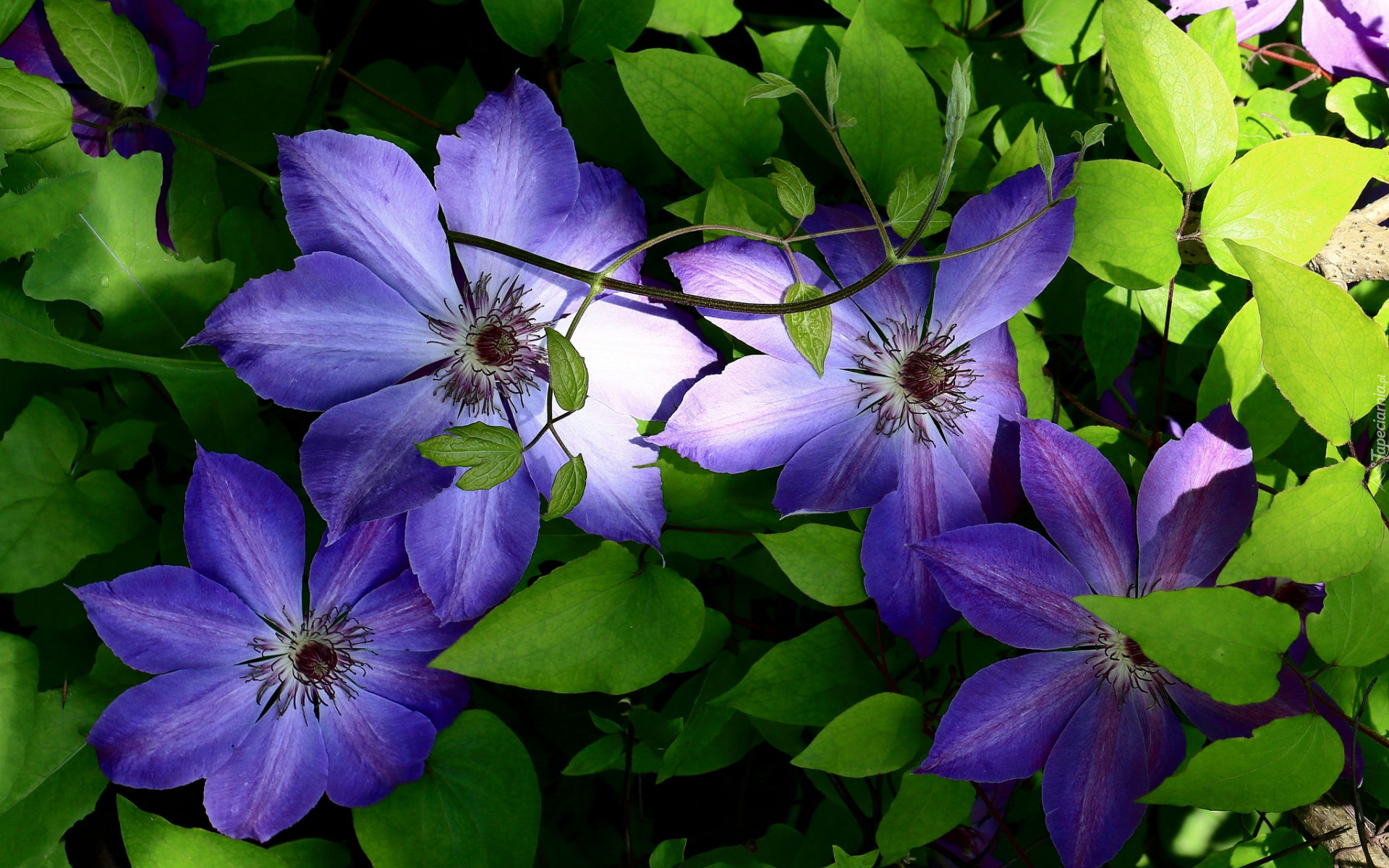 Edytor tapety: Fioletowe powojniki pośród zielonych liści