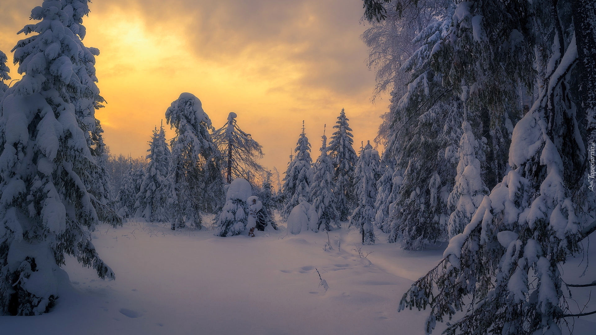 Edytor tapety: Wschód słońca nad zaśnieżonym lasem