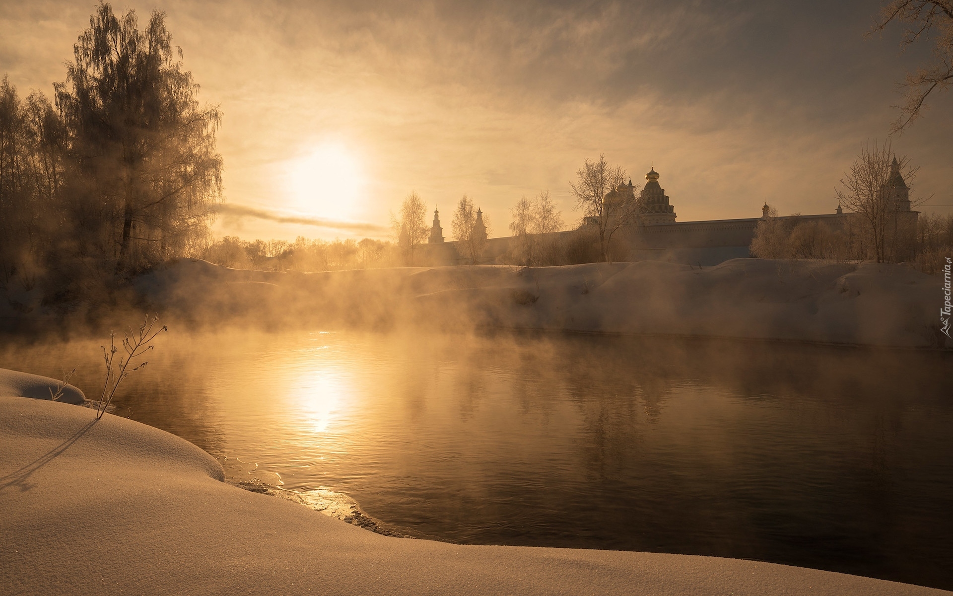 Edytor tapety: Cerkiew na zaśnieżonym brzegu zamglonej o poranku rzeki