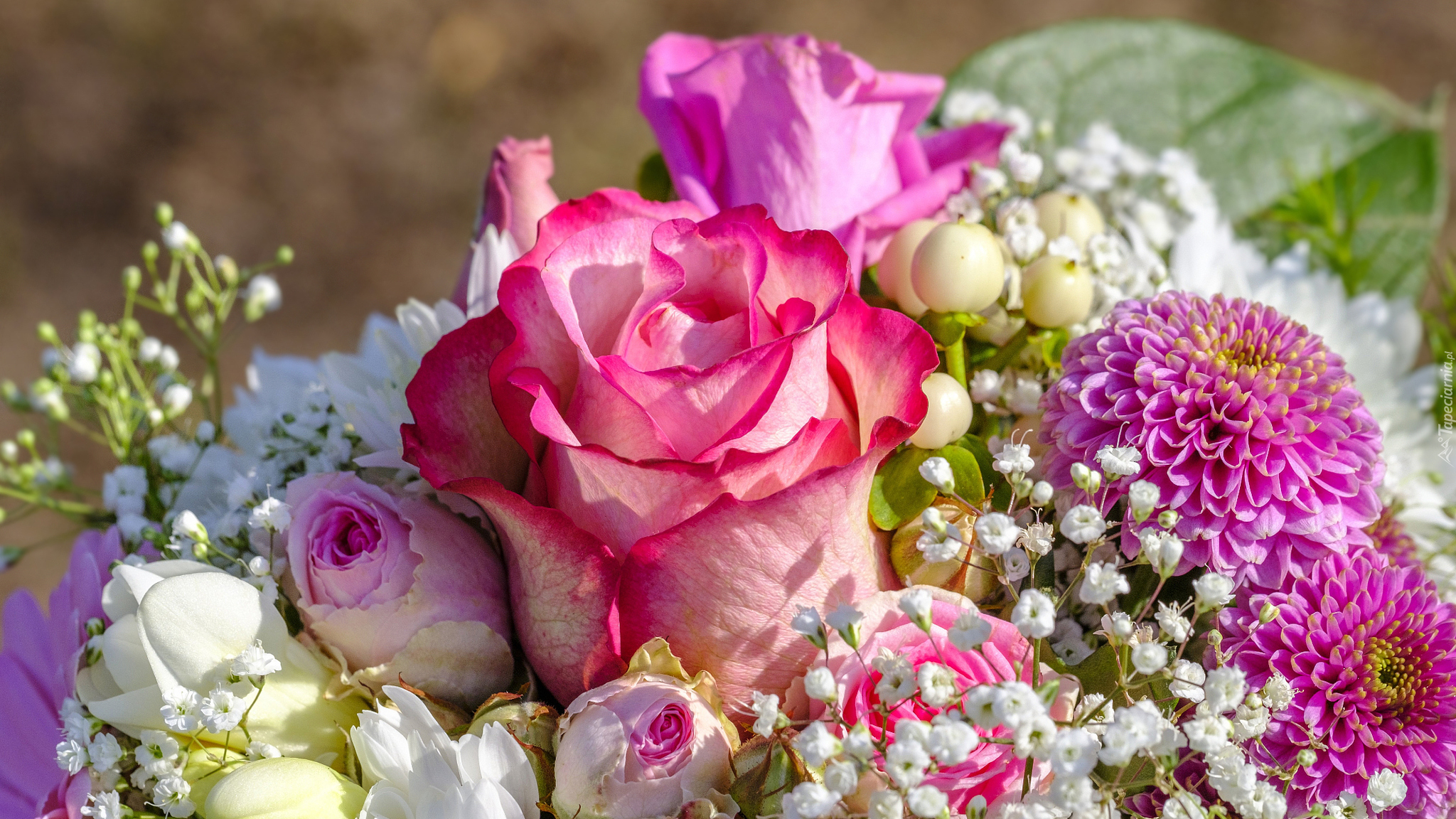 Edytor tapety: Róże i dalie w bukiecie z gipsówką