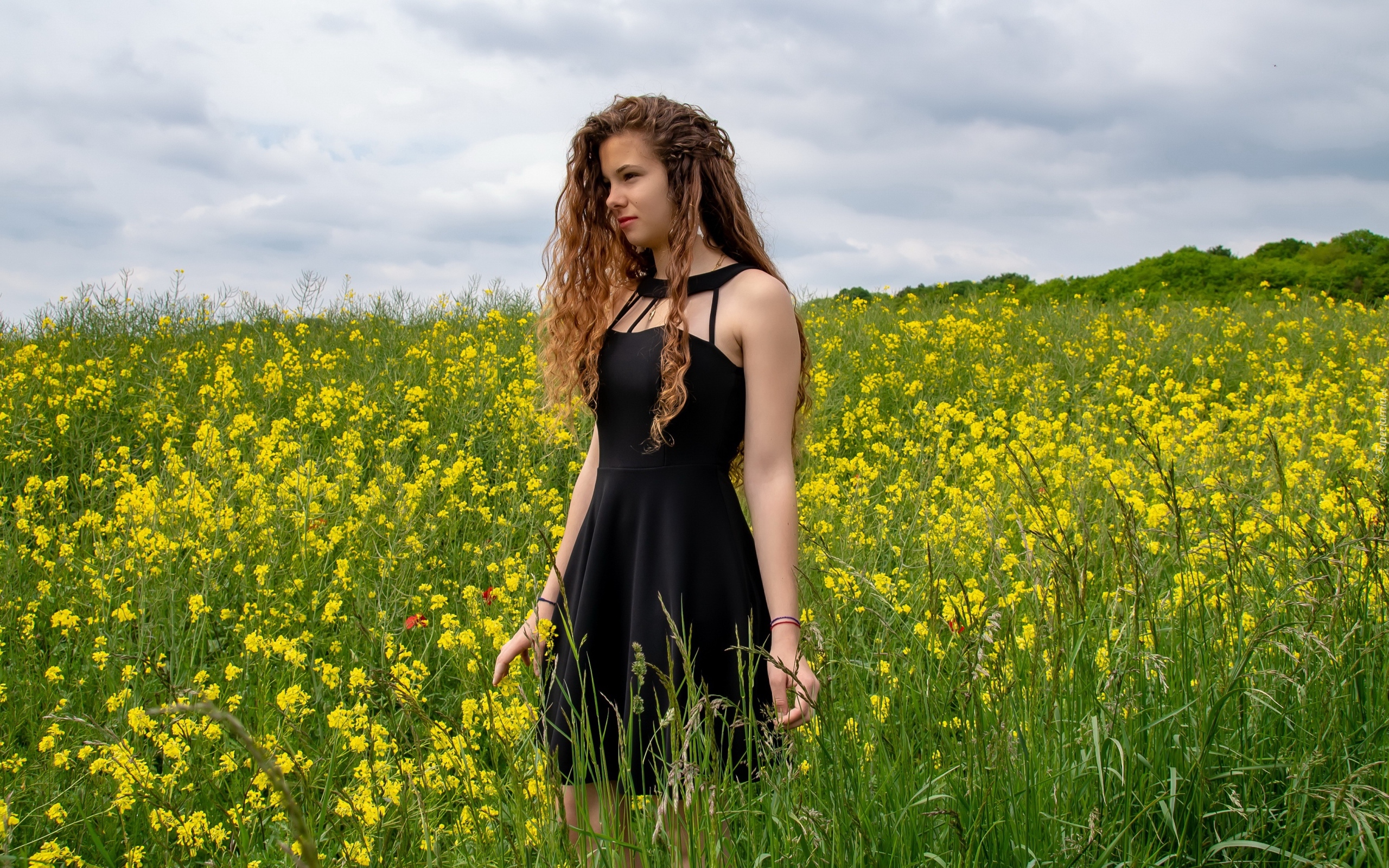 Edytor tapety: Kobieta w czarnej sukience na polu rzepaku