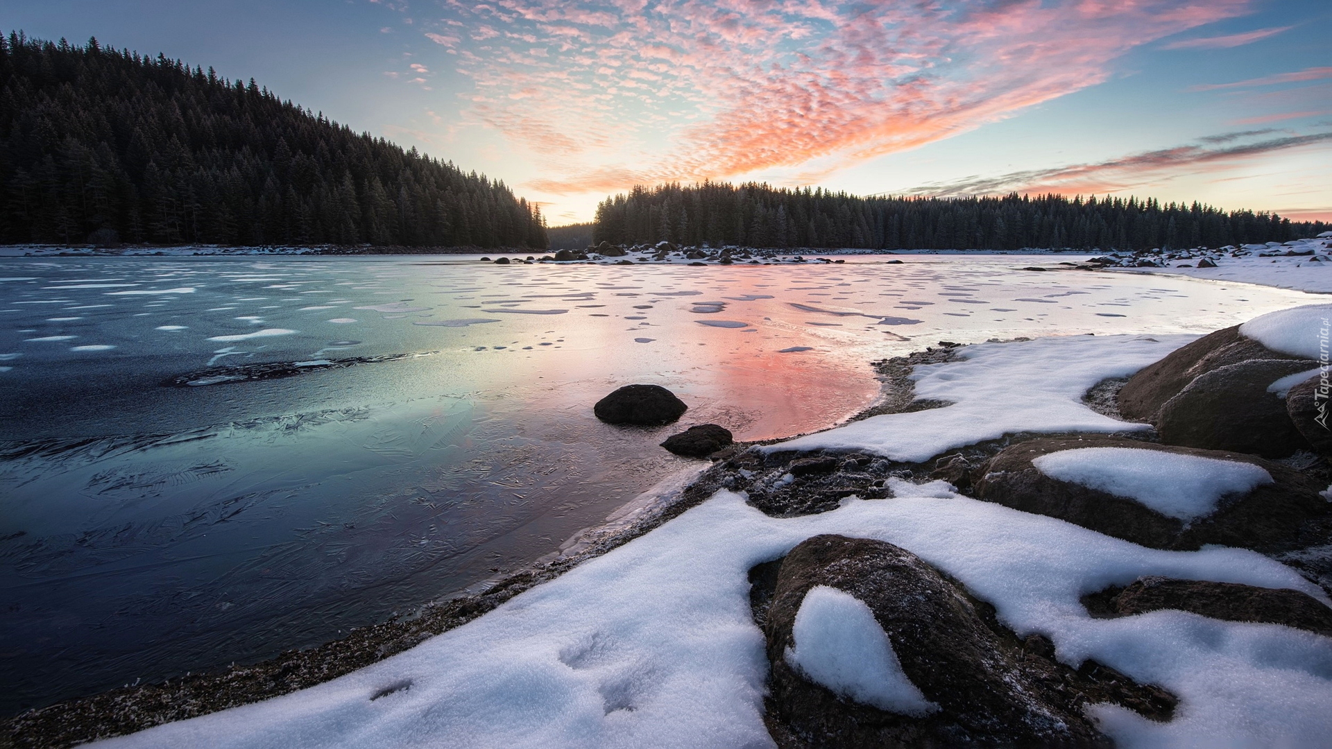 Edytor tapety: Drzewa i kamienie nad brzegiem zamarzniętego jeziora