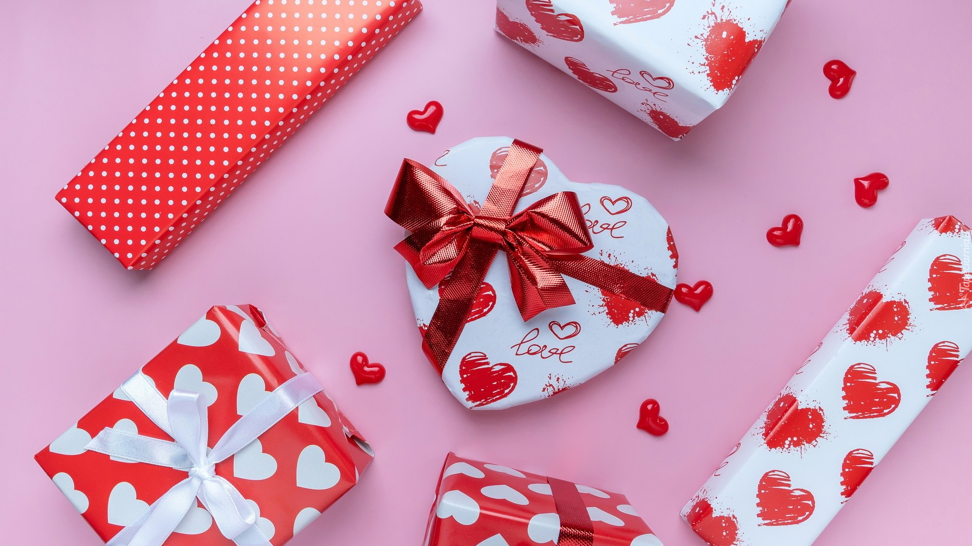 Edytor tapety: Serce obwiązane kokardą wśród prezentów