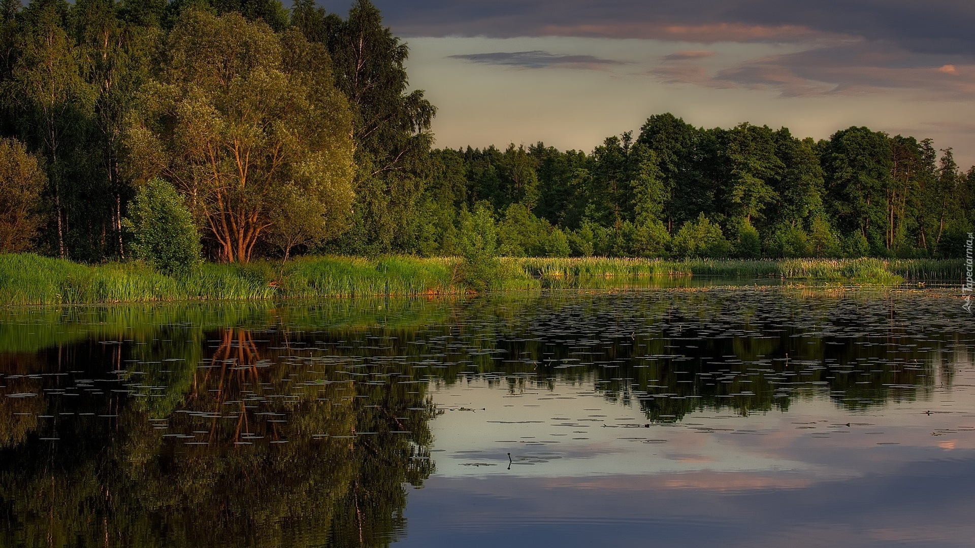Edytor tapety: Zielone drzewa i trawy dookoła jeziora